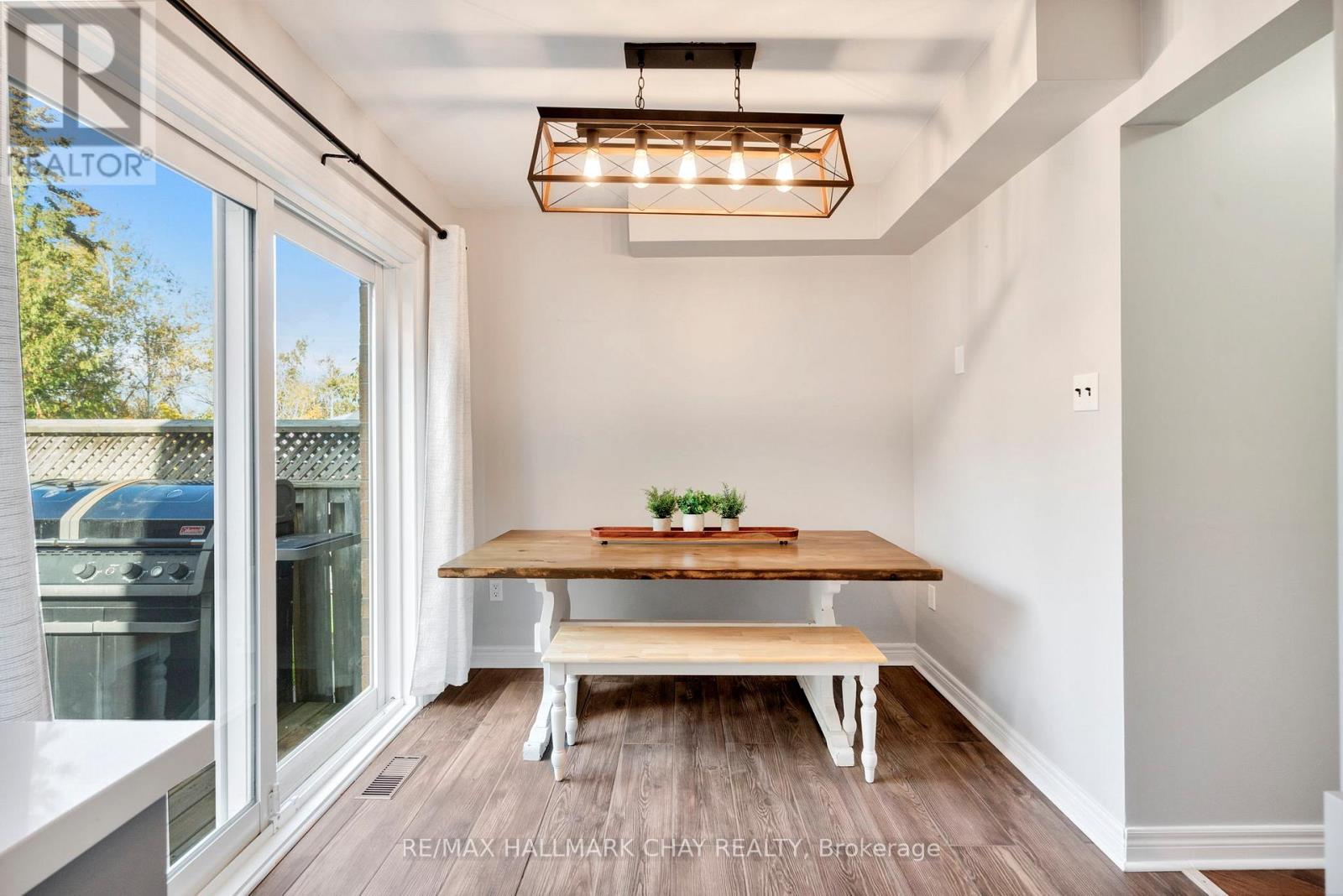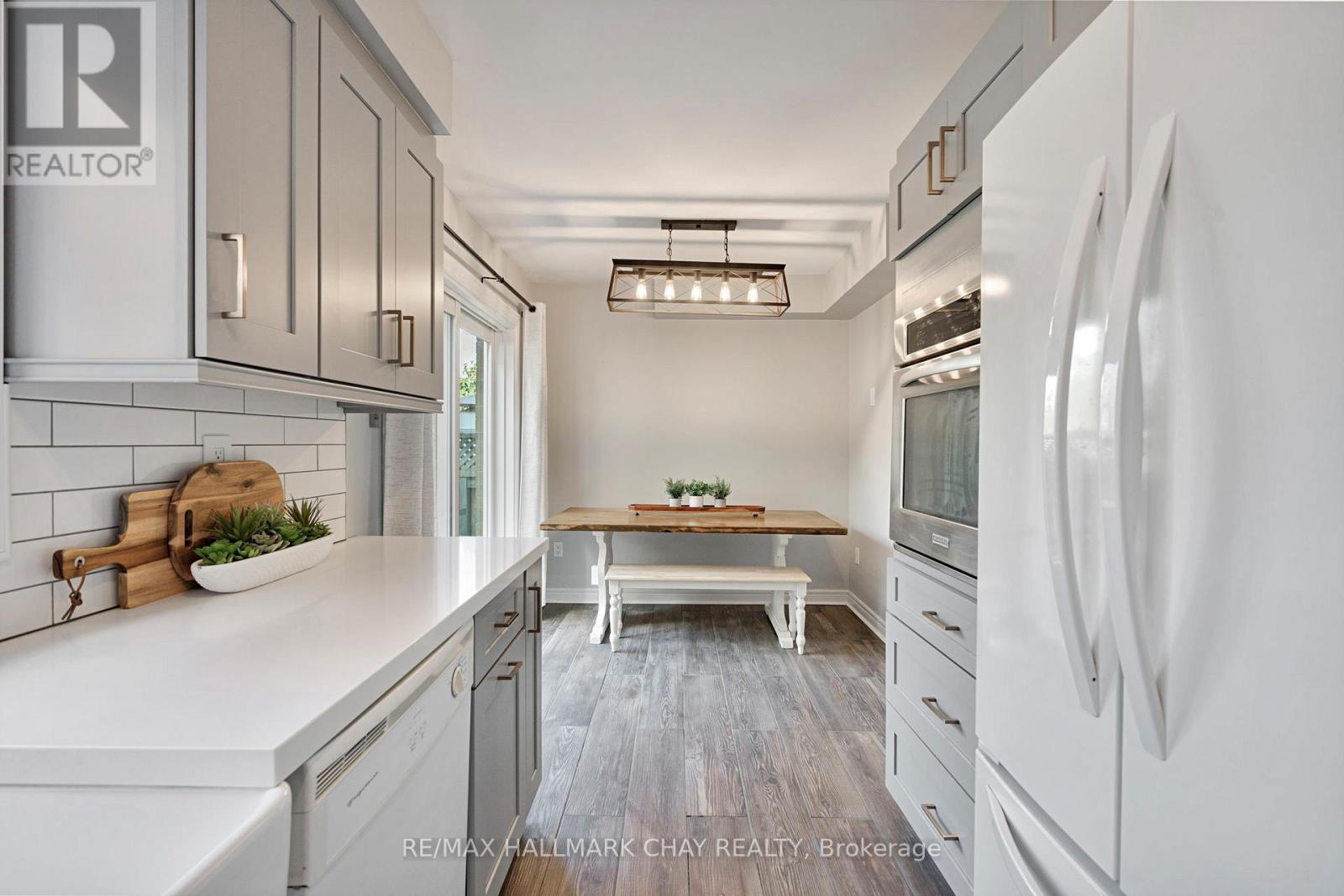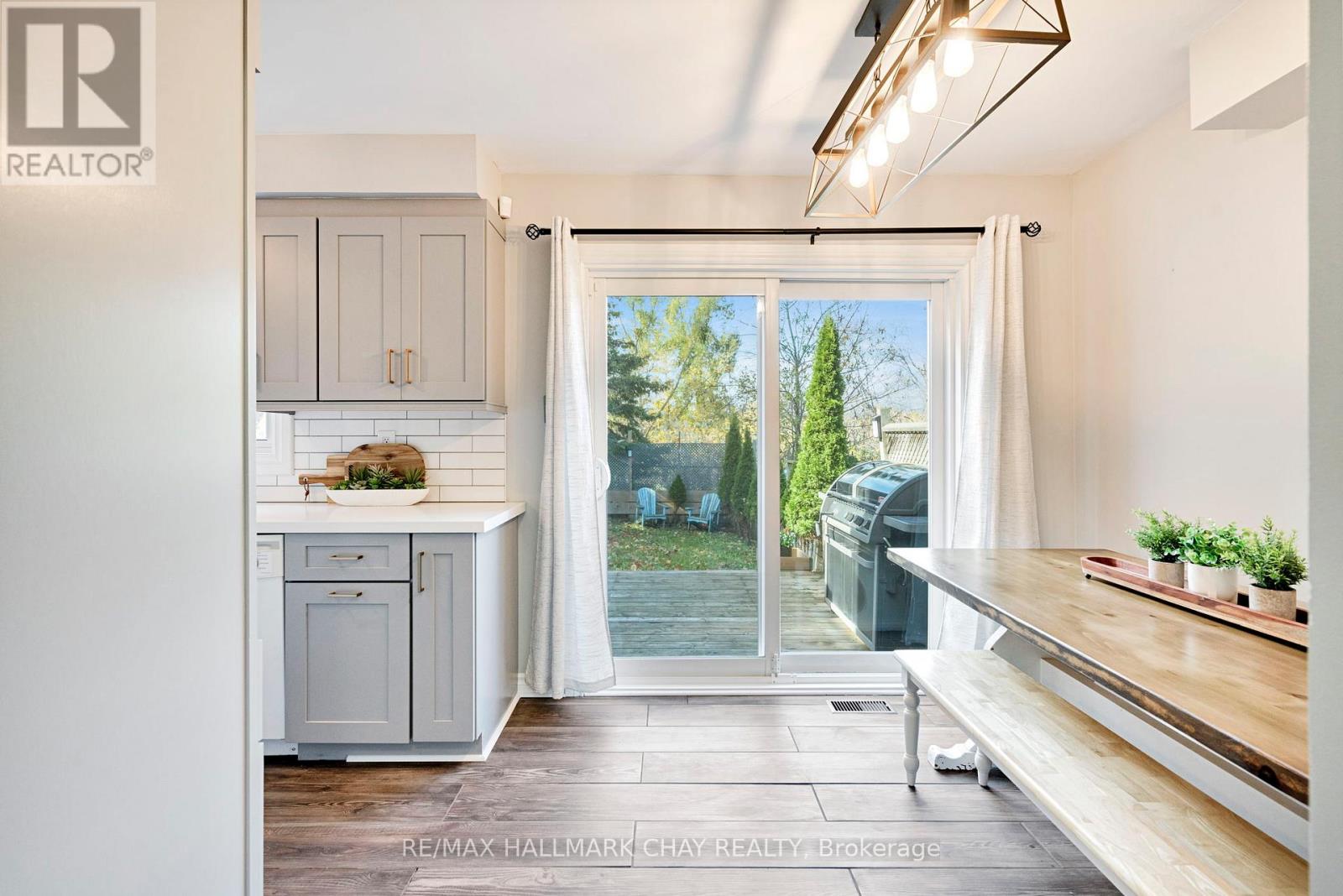 Welcome to this beautifully updated end-unit townhome, where comfort and modern design come together in one perfect package. Step inside to a spacious foyer with built-in shelving and a convenient bench - ideal for busy mornings and everyday organization. The bright living room features gleaming hardwood floors and large windows that fill the space with natural light, creating a warm and inviting atmosphere.The fully renovated kitchen is a standout, offering built-in appliances, stylish tiling, updated light fixtures, and a generous eat-in area with a walkout to a large deck and hot tub. The landscaped, private backyard is perfect for relaxing or entertaining, and it backs onto a walking path that leads directly to the elementary school and Huronia Park - a dream setting for families and nature lovers alike. Upstairs, you'll find three spacious bedrooms, including a primary suite with a walk-in closet and a 4-piece ensuite bathroom. The main bathroom is equally generous in size, offering plenty of space for the family. A partially finished basement adds extra flexibility with a large recreation room, ideal for a media space, home gym, or play area. With thoughtful updates throughout - including an updated roof, windows, powder room, modern finishes, and a bright layout- this move-in ready home is ready to impress. Enjoy the convenience of being close to parks, schools, trails, and all the amenities that make this neighbourhood such a desirable place to live. (id:53503)