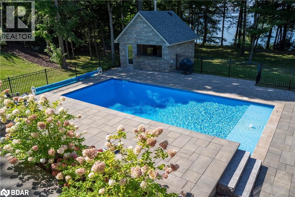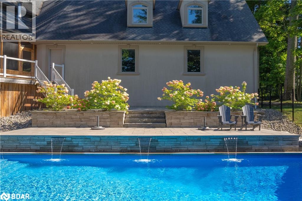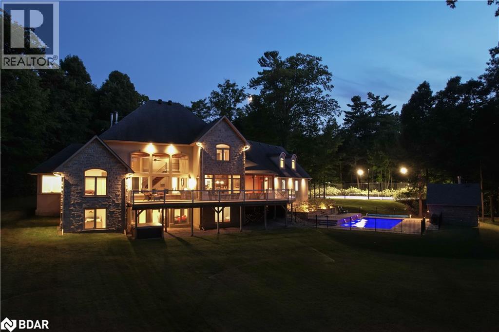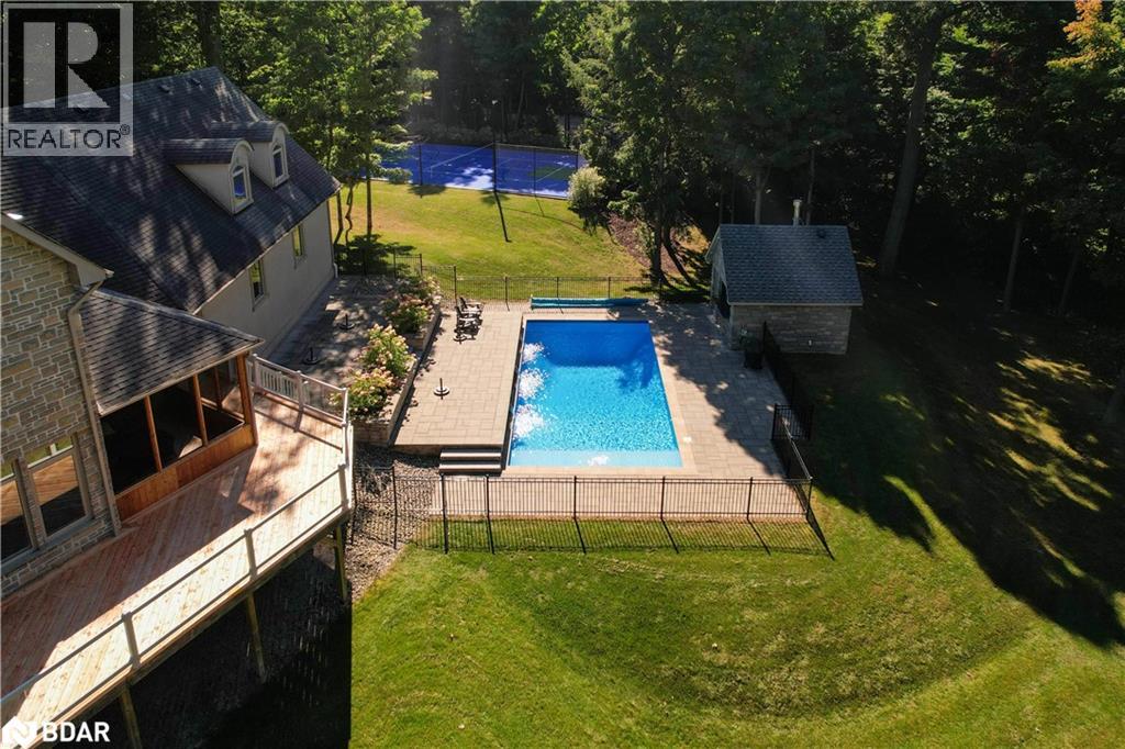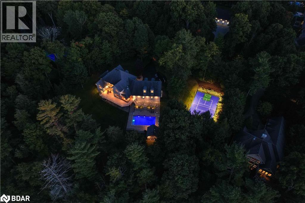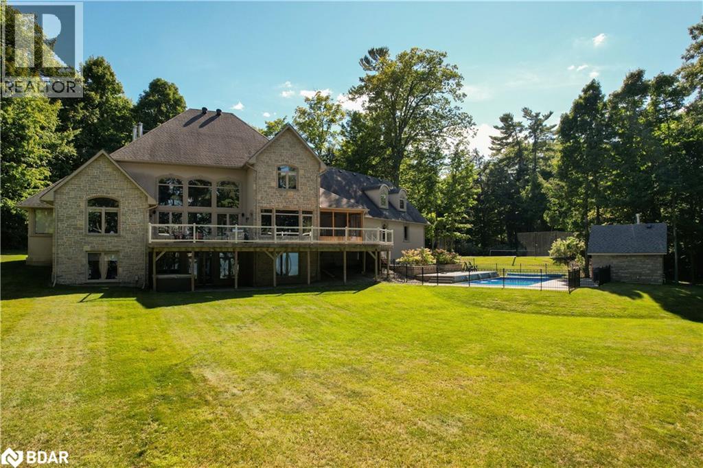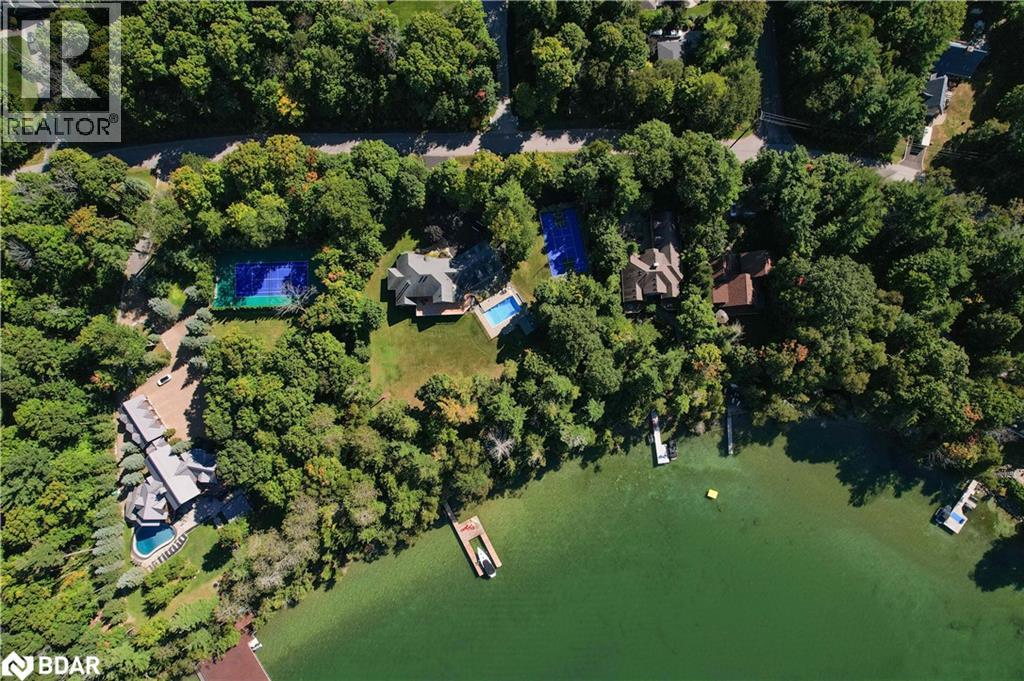 Welcome to this stunning luxury waterfront estate, a blend of elegant design, modern amenities, and breathtaking natural beauty. The exterior showcases a refined mix of stone, stucco, and wood beam accents, setting the stage for the architectural charm that awaits inside. Step into a spacious interior featuring rich hardwood floors throughout the main level. A great room with soaring two-story ceilings is adorned with wood beam details and a wall of windows offering captivating views of the expansive rear yard and waterfront. The main floor also boasts a formal dining room and an office with French doors and vaulted ceilings. The gourmet kitchen is a chef's dream, equipped with granite countertops, a large island with breakfast bar seating, a Subzero fridge, Viking gas range, and walk-in pantry. Adjacent is a cozy Muskoka room with built-in speakers and a gas line for your BBQ, perfect for year-round entertaining. The main floor primary suite is a private retreat, featuring a walkout to the deck with tranquil views of the yard, a luxurious 6-piece ensuite, and a spacious walk-in closet. The upper level includes three more bedrooms, a 5-piece bath, and a spacious great room over the garage with in-floor heating. The fully finished walkout basement offers a theatre and games room with surround sound, two additional bedrooms, a 4-piece bathroom, and radiant in-floor heating. The backyard is an entertainer's paradise, boasting an in-ground heated saltwater pool with waterfall features, lighting, and a tanning ledge, surrounded by multiple seating areas. The custom-built pool house includes a bar area, equipment room, and storage. For sports enthusiasts, enjoy a custom sport court complete with LED lighting, basketball nets, and multi-sport setup. A massive dock, built in 2023, includes a 40-foot slip, full lift, shore power, and lighting. This property is a masterpiece of luxury living, offering endless possibilities for relaxation, entertainment, and adventure. (id:53503)