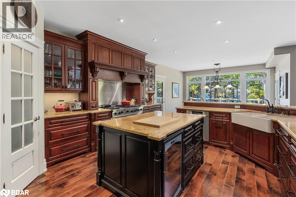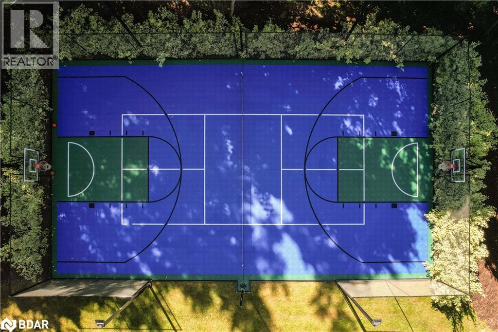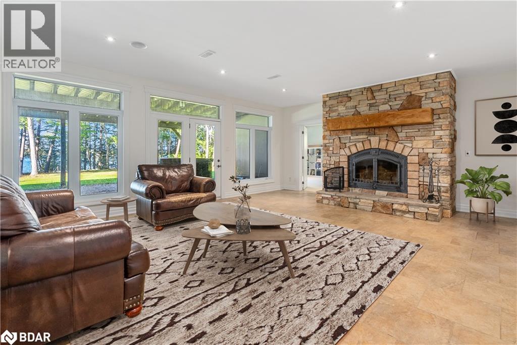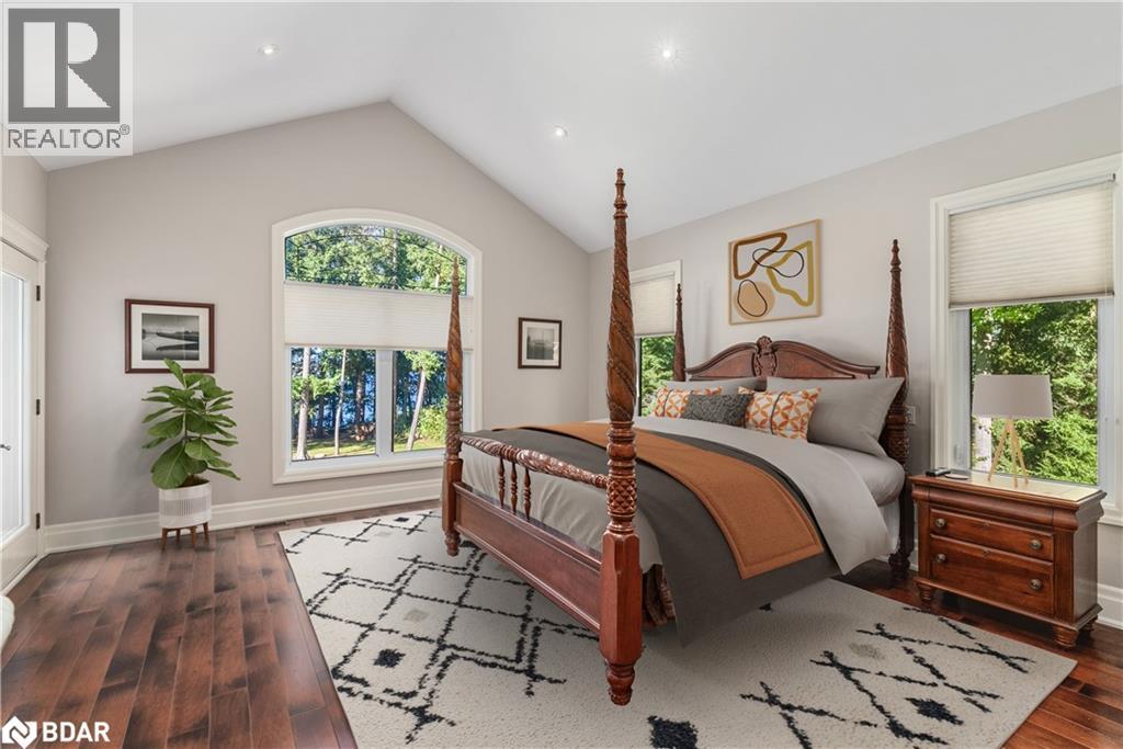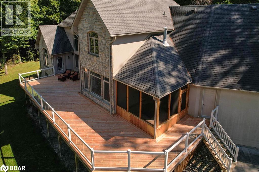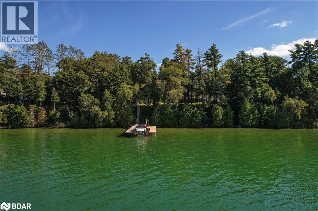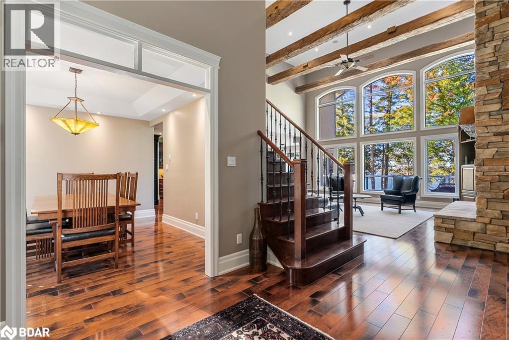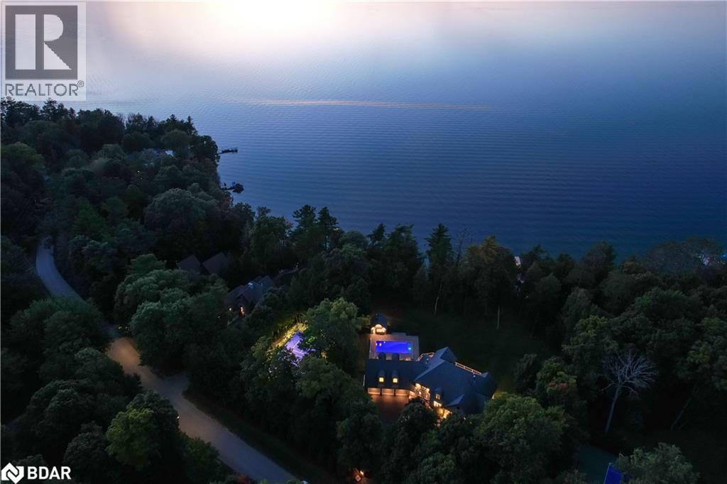 Welcome to this stunning luxury waterfront estate, a blend of elegant design, modern amenities, and breathtaking natural beauty. The exterior showcases a refined mix of stone, stucco, and wood beam accents, setting the stage for the architectural charm that awaits inside. Step into a spacious interior featuring rich hardwood floors throughout the main level. A great room with soaring two-story ceilings is adorned with wood beam details and a wall of windows offering captivating views of the expansive rear yard and waterfront. The main floor also boasts a formal dining room and an office with French doors and vaulted ceilings. The gourmet kitchen is a chef's dream, equipped with granite countertops, a large island with breakfast bar seating, a Subzero fridge, Viking gas range, and walk-in pantry. Adjacent is a cozy Muskoka room with built-in speakers and a gas line for your BBQ, perfect for year-round entertaining. The main floor primary suite is a private retreat, featuring a walkout to the deck with tranquil views of the yard, a luxurious 6-piece ensuite, and a spacious walk-in closet. The upper level includes three more bedrooms, a 5-piece bath, and a spacious great room over the garage with in-floor heating. The fully finished walkout basement offers a theatre and games room with surround sound, two additional bedrooms, a 4-piece bathroom, and radiant in-floor heating. The backyard is an entertainer's paradise, boasting an in-ground heated saltwater pool with waterfall features, lighting, and a tanning ledge, surrounded by multiple seating areas. The custom-built pool house includes a bar area, equipment room, and storage. For sports enthusiasts, enjoy a custom sport court complete with LED lighting, basketball nets, and multi-sport setup. A massive dock, built in 2023, includes a 40-foot slip, full lift, shore power, and lighting. This property is a masterpiece of luxury living, offering endless possibilities for relaxation, entertainment, and adventure. (id:53503)