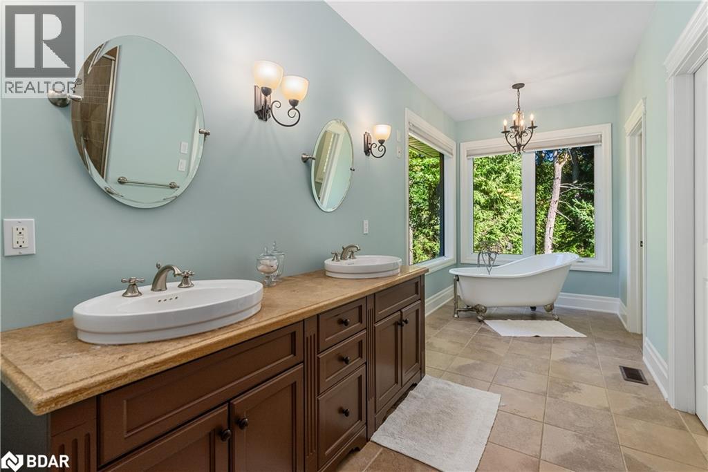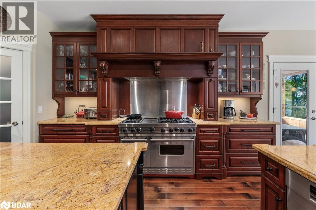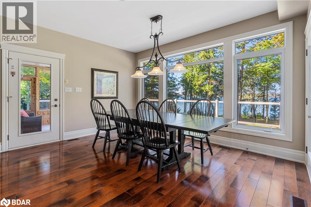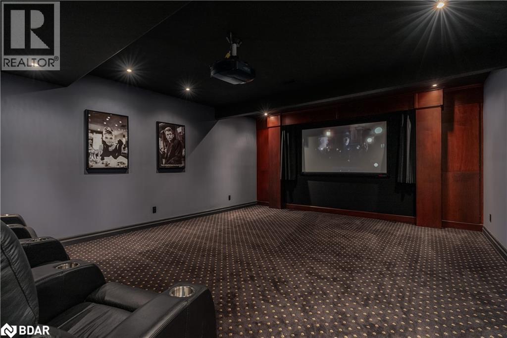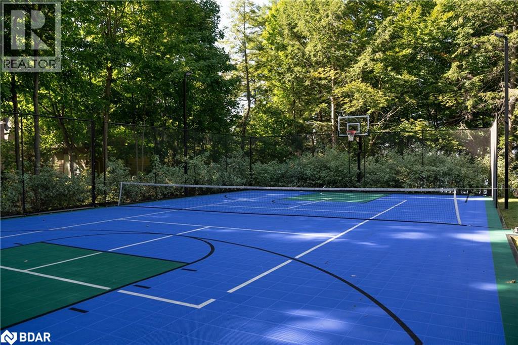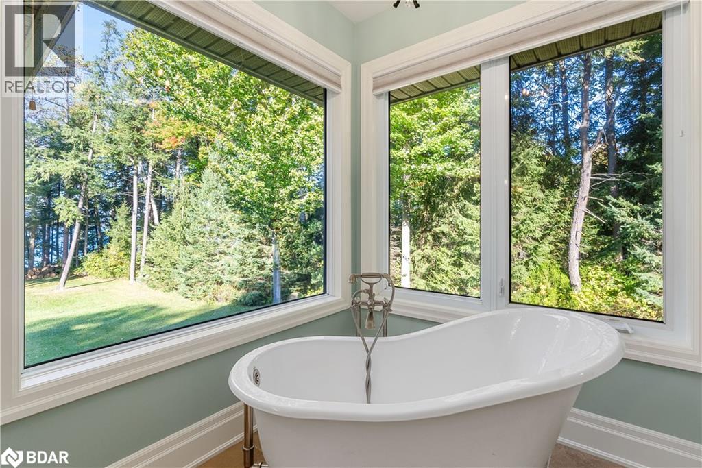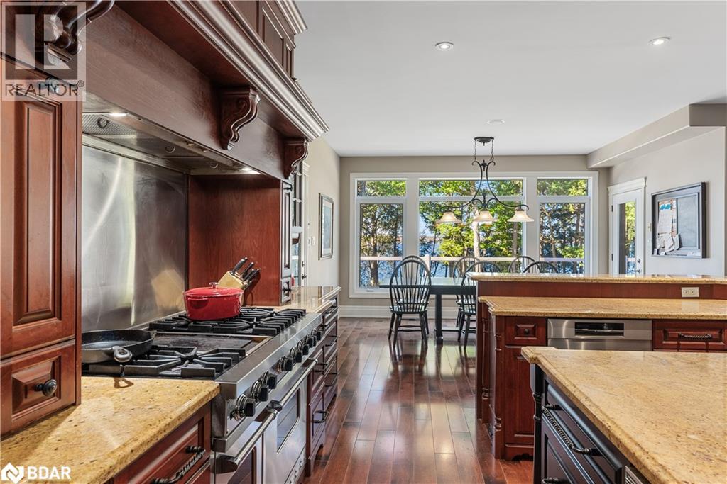 Welcome to this stunning luxury waterfront estate, a blend of elegant design, modern amenities, and breathtaking natural beauty. The exterior showcases a refined mix of stone, stucco, and wood beam accents, setting the stage for the architectural charm that awaits inside. Step into a spacious interior featuring rich hardwood floors throughout the main level. A great room with soaring two-story ceilings is adorned with wood beam details and a wall of windows offering captivating views of the expansive rear yard and waterfront. The main floor also boasts a formal dining room and an office with French doors and vaulted ceilings. The gourmet kitchen is a chef's dream, equipped with granite countertops, a large island with breakfast bar seating, a Subzero fridge, Viking gas range, and walk-in pantry. Adjacent is a cozy Muskoka room with built-in speakers and a gas line for your BBQ, perfect for year-round entertaining. The main floor primary suite is a private retreat, featuring a walkout to the deck with tranquil views of the yard, a luxurious 6-piece ensuite, and a spacious walk-in closet. The upper level includes three more bedrooms, a 5-piece bath, and a spacious great room over the garage with in-floor heating. The fully finished walkout basement offers a theatre and games room with surround sound, two additional bedrooms, a 4-piece bathroom, and radiant in-floor heating. The backyard is an entertainer's paradise, boasting an in-ground heated saltwater pool with waterfall features, lighting, and a tanning ledge, surrounded by multiple seating areas. The custom-built pool house includes a bar area, equipment room, and storage. For sports enthusiasts, enjoy a custom sport court complete with LED lighting, basketball nets, and multi-sport setup. A massive dock, built in 2023, includes a 40-foot slip, full lift, shore power, and lighting. This property is a masterpiece of luxury living, offering endless possibilities for relaxation, entertainment, and adventure. (id:53503)