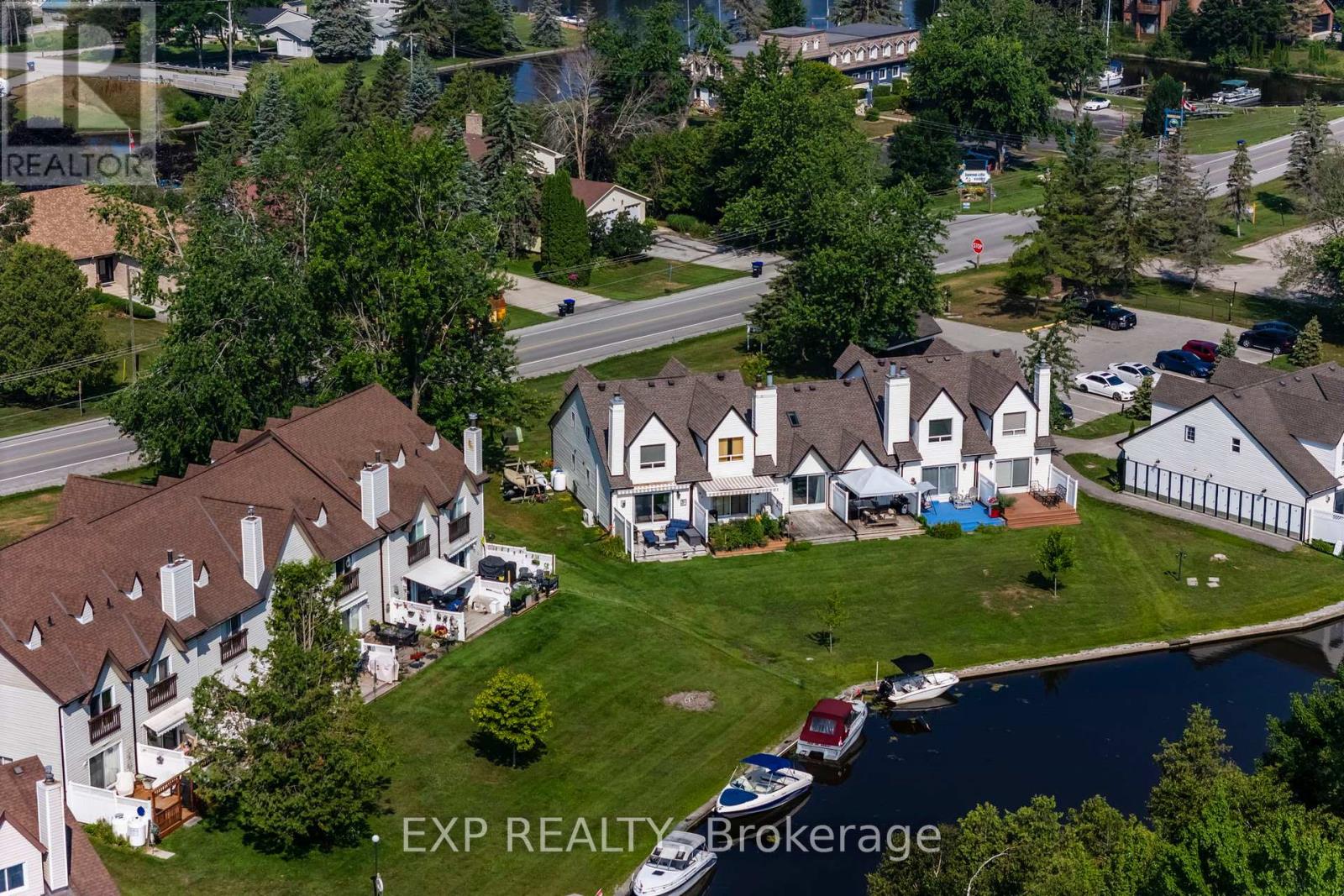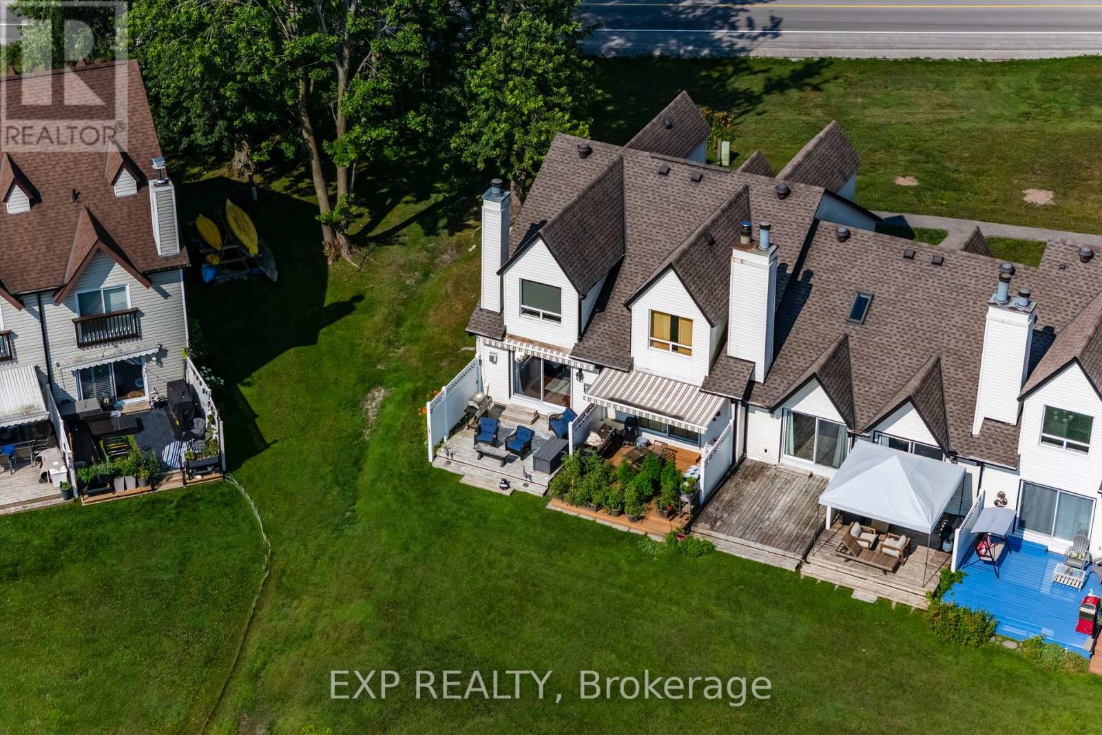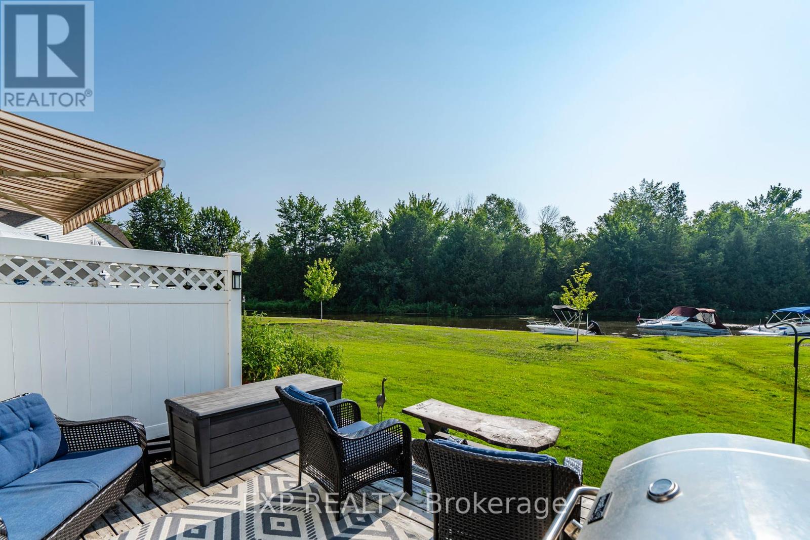 Discover this beautifully renovated Rarely offered end-unit 2-bedroom, 2-bath waterfront townhome in the heart of Lagoon City, perfectly situated on the peaceful Gondola Lagoon with private boat mooring and direct access to Lake Simcoe and the Trent-Severn Waterway. This bright and airy home features a vaulted ceiling, and large patio doors that fill the space with natural light. The open-concept living, dining, and kitchen area offers a cozy gas fireplace, gas BBQ hookup, and a walkout to a private waterfront deck with Awning ideal for entertaining or relaxing as you watch the boats drift by. The remodeled main bathroom, fresh paint throughout, and spray-foamed crawlspace for improved energy efficiency add to the home's comfort. The spacious loft-style primary bedroom overlooks the water and mature trees, and features a 4-piece ensuite and an office/reading nook. Enjoy cooking in the modern kitchen with stainless steel appliances, including a wine cooler, and benefit from a dual system air conditioner for both heating and cooling, plus a whole-home water filtration system for added peace of mind. This rarely offered end-unit is part of the sought-after community, which features a professionally landscaped grounds, and direct access to two private sandy beaches.. Lagoon City also boasts a full-service marina, year-round clubhouse, tennis & pickleball courts, miles of walking and biking trails, and easy access to golf courses, leash-free dog park, and Casino Rama just a short drive away. With municipal services, high-speed internet, and only 1.5 hours from the GTA, this is the perfect full-time home, cottage retreat, or work-from-home escape. Start your new waterfront lifestyle today in this exceptional end-unit townhome a true gem in a one-of-a-kind community. (id:53503)