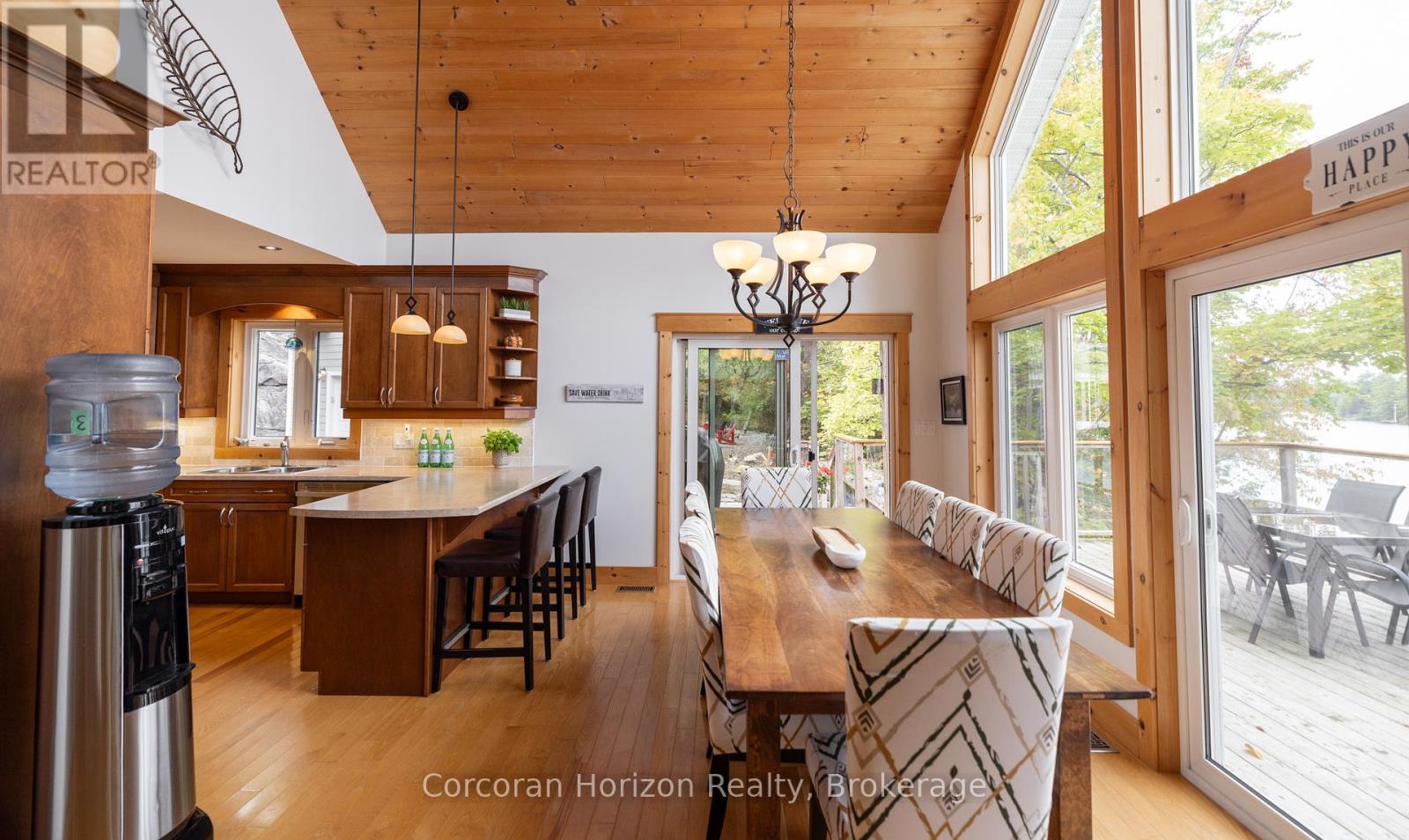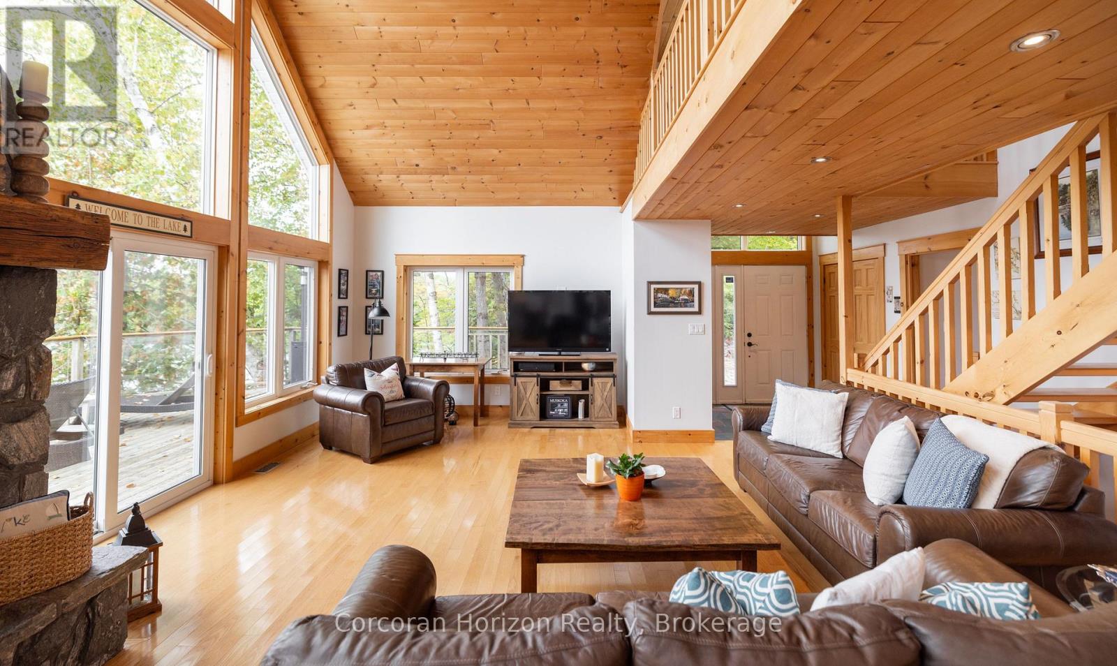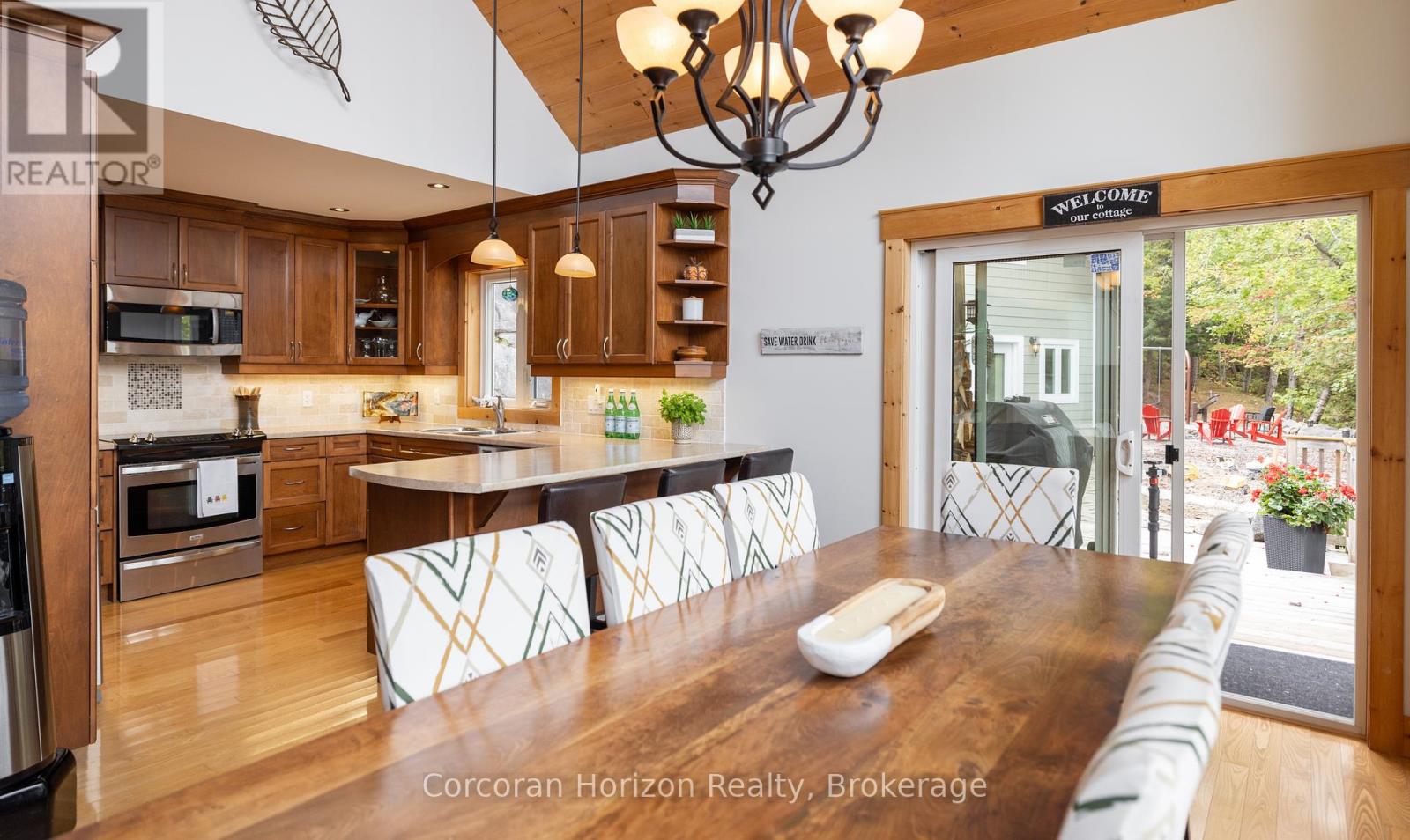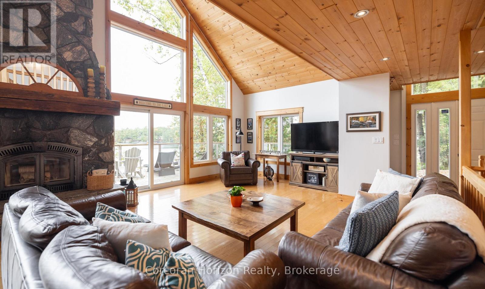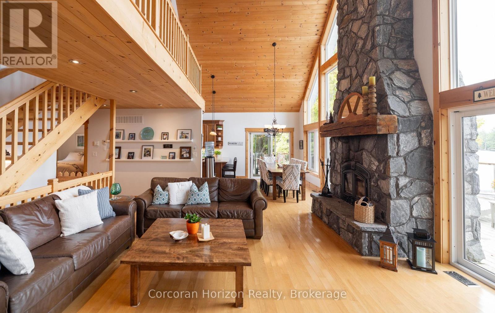 Escape to your dream retreat on the shores of Gloucester Pool, just steps from the Big Chute. This 5-bedroom, 3-bathroom cottage home delivers the best of waterfront living with a balance of adventure, relaxation, and charm.The main level, with custom granite fireplace, features a spacious eat-in kitchen, open-concept dining and living areas with vaulted ceilings, and a seamless walkout to a large deck overlooking the lake. A cozy recreation room offers the perfect space to unwind after a day outdoors. Set against rugged granite outcroppings and surrounded by mature trees, the property offers privacy, landscaped grounds for family fun, and multiple outdoor living areas designed for entertaining. At the shoreline, a well-built double boat port with cable lift and additional docking makes lake life effortless, with deep, clean water ideal for swimming and boating.This location is a four-season playground: direct access to the Trent-Severn Waterway for boaters, excellent fishing from your own shore, and nearby snowmobile and ATV trails for winter adventure. Hiking trails, golf, and ski hills are all within easy reach. Whether gathering with family, hosting friends, or seeking a peaceful escape, this Gloucester Pool property is the complete package, a true four-season escape. (id:53503)