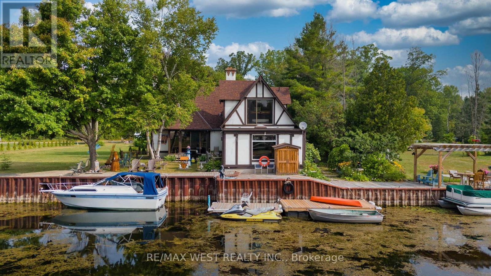Unlimited Possibilities! Waterfront property on Georgian Bay with access to all the Great Lakes, the Atlantic Ocean, and beyond! This 2000 sq ft Tudor home meets so many needs with its sheltered dockage. This fully finished home features 3 large bedrooms, one ideal as a separate in-law suite, and a large detached garage with potential for an accessory dwelling unit for additional rental space or living quarters. A Bunkie-style fully powered office area is also on the property. Ample parking and 75 feet of waterfront make this home a must-see to fully appreciate its unique features. (id:53503)