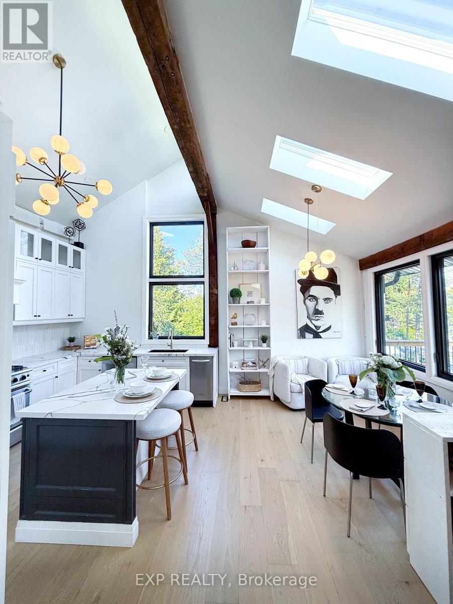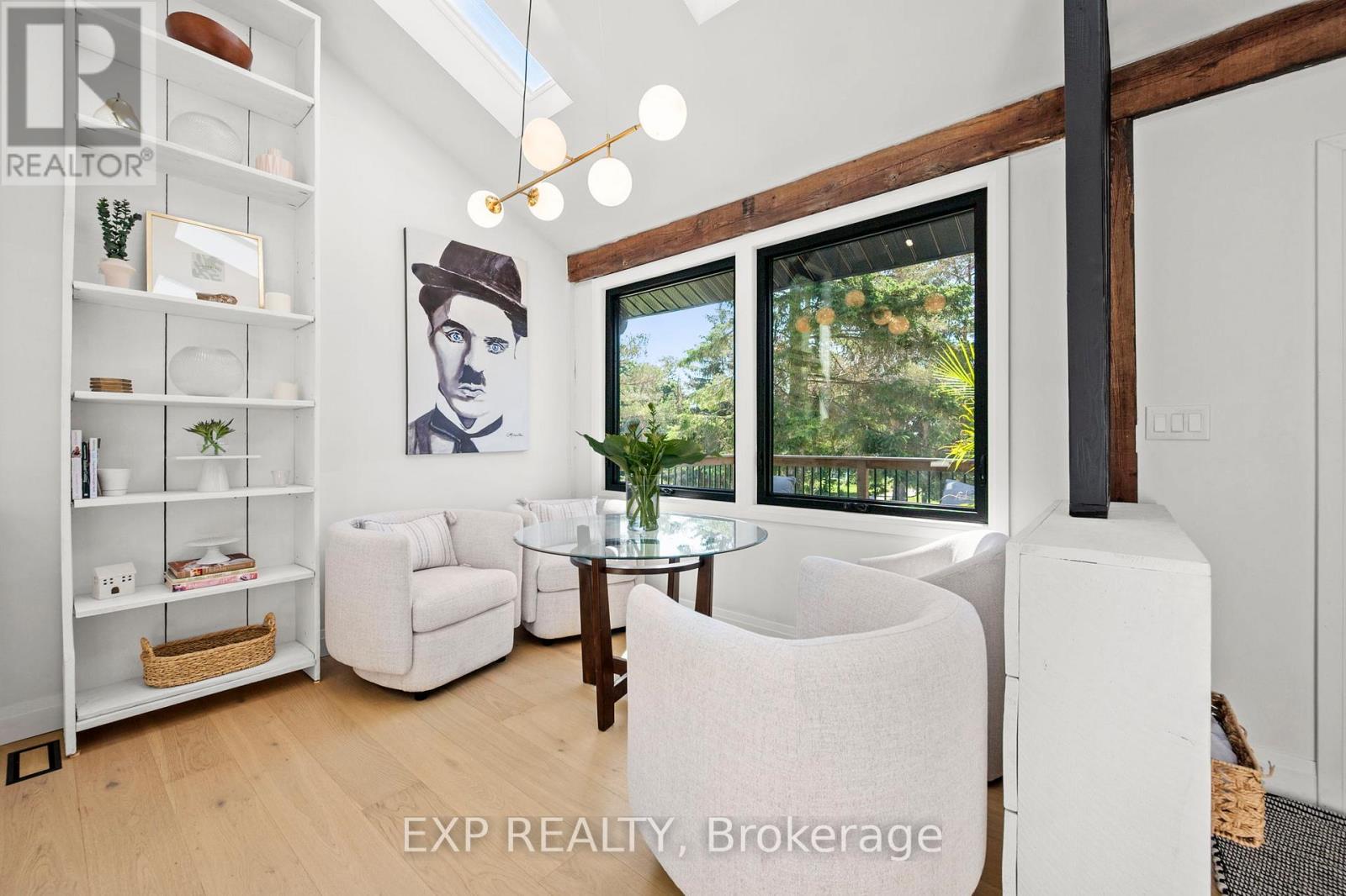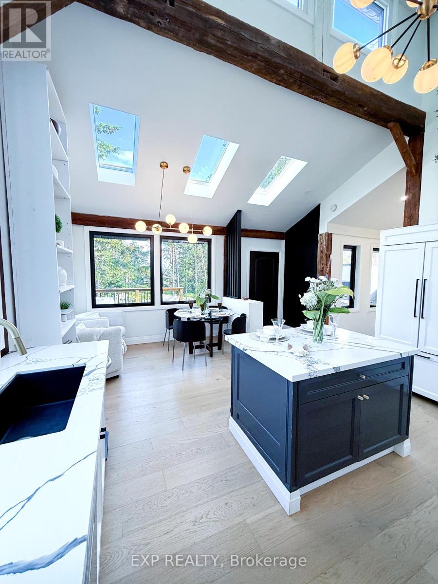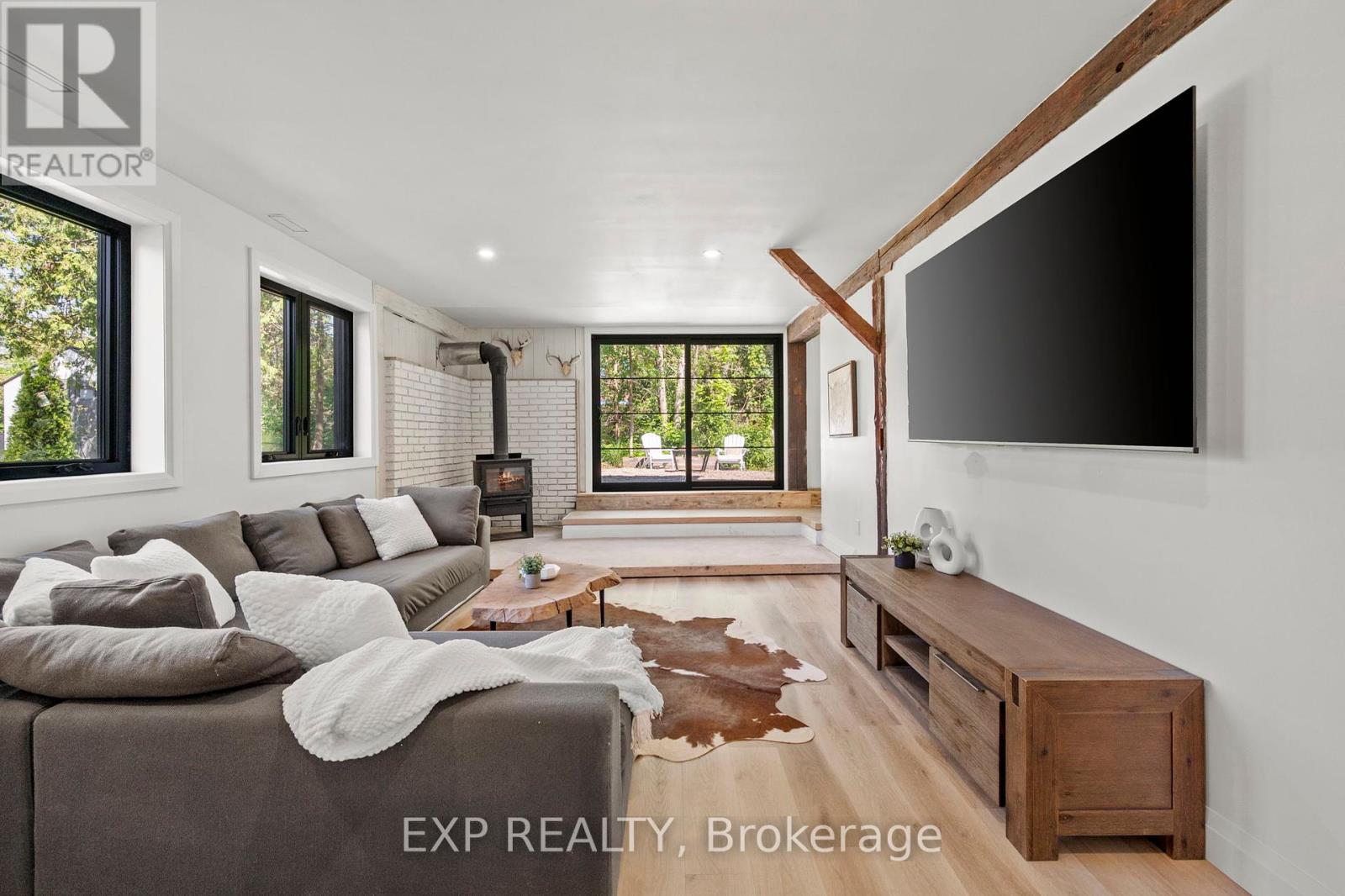Nestled in the serene enclave of rural Oro Medonte, this beautifully renovated 1+2 beds chalet style retreat offers the perfect fusion of rustic charm and contemporary elegance. Steeped in Character, yet thoughtfully updated, 1800sq ft of fully finished living space, this home presents an exceptional lifestyle opportunity just steps from the lake. Rich vaulted ceilings with exposed wood beams, expansive windows and chalet-style design elements flood the home with natural light and warmth. The kitchen is the heart of the home, and features stainless steel/built-in appliances, quartz countertops and custom cabinetry. The primary suite/ensuite will make you want to stay and never leave. Enjoy cozy nights by the newer wood stove while watching movies or just hanging out with the family. Don't miss this unique opportunity in an amazing family friendly neighborhood. Recent updates (all 2023)include: HVAC, shingles, central vac, 200 amp panel, Windows, bathrooms & flooring throughout. (id:53503)