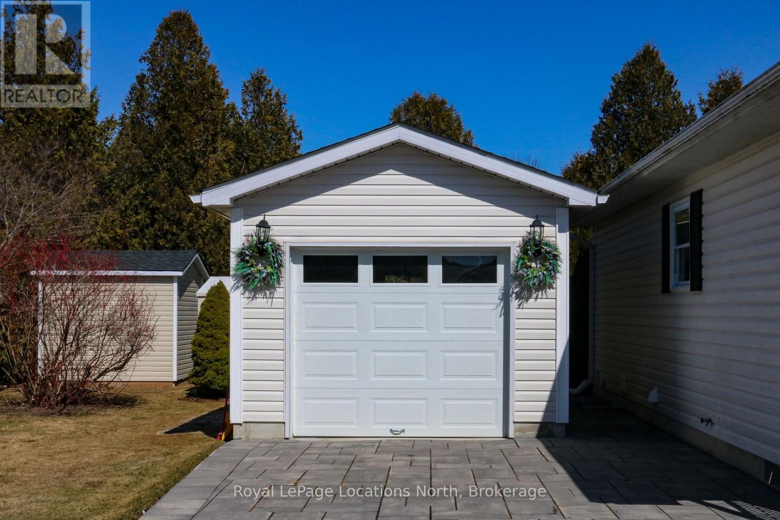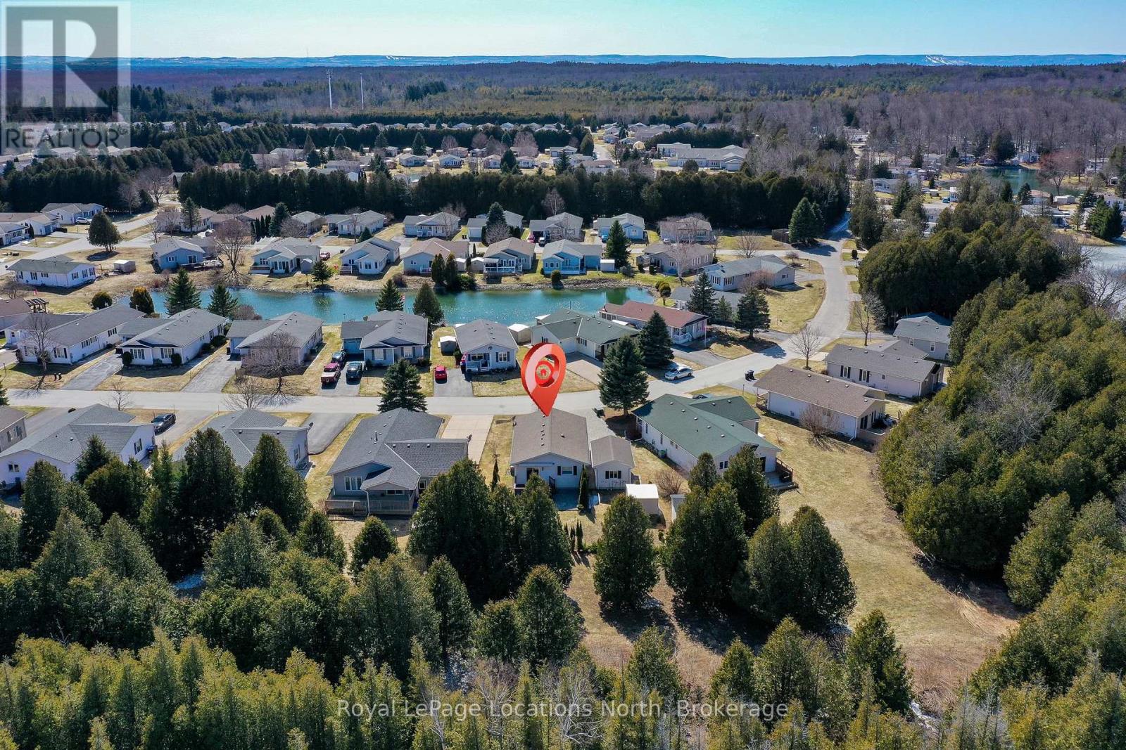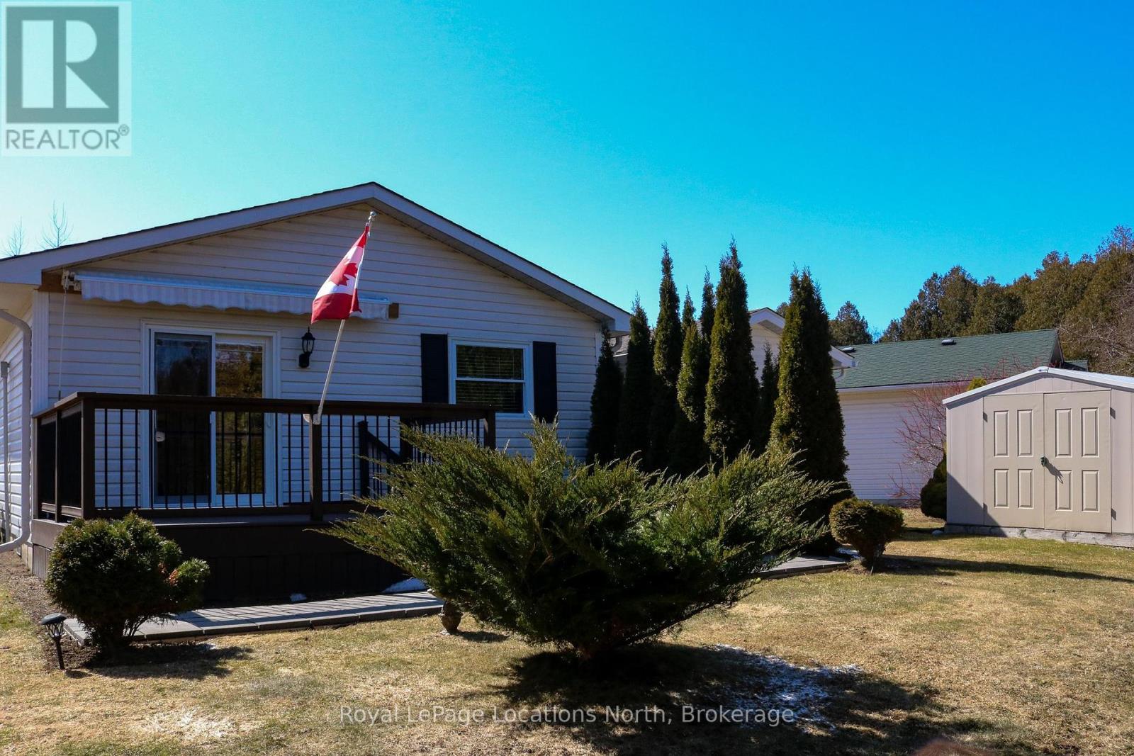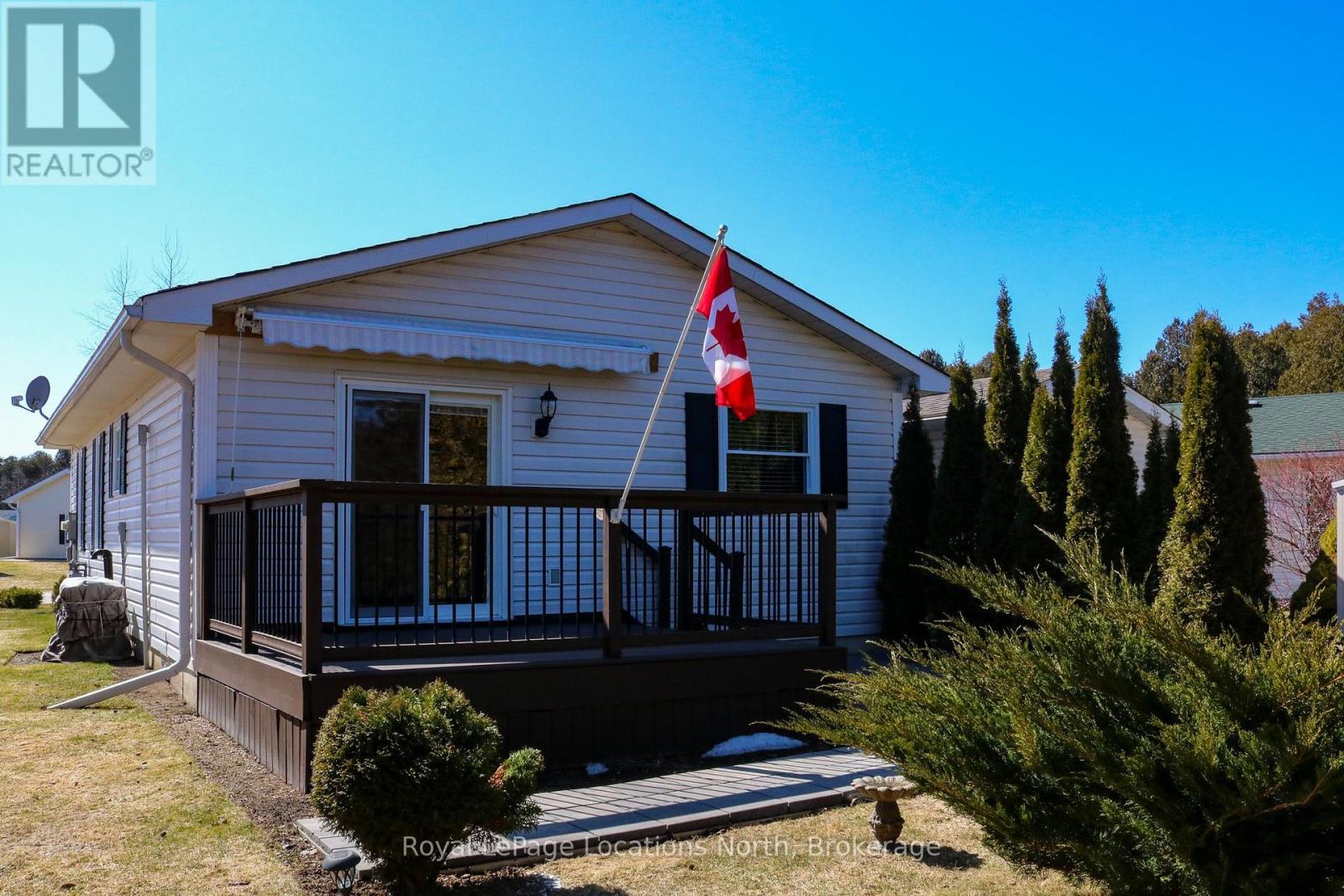Amazing opportunity to own a fully detached home in Park Place, one of Wasaga Beach's premier adult/retirement land-lease communities. This beautifully maintained 2-bedroom home has a custom-built detached & insulated garage, backs onto complete privacy (a 400-acre tract of land owned by the Province of Ontario), and has a long, long list of interior and exterior upgrades and improvements (a list totalling well over $100,000 is available upon request). As soon as you step inside, you will immediately notice the amazing features that this top-quality home has to offer, from the open-concept design of the principal living areas to the fact that all of the flooring is top-quality hardwood & porcelain tile flooring and custom window treatments throughout. The gorgeous custom kitchen includes granite counters and 3 stainless-steel appliances and is open to the large, bright eating area. This area is also visible to/from the living room (with hardwood floors & vaulted ceilings).The primary bedroom has a double closet, and the 2nd bedroom has a large closet & sliding doors to the sundeck overlooking that beautifully landscaped and very private backyard. The house also offers a stackable washer/dryer for laundry convenience. Outdoor amenities include a stunningly beautiful interlocking brick driveway, walkways & rear patio, a covered front porch/veranda, a 10' x 12' sundeck (with awning), & a 10' x 10' shed. Park Place is a gated adult (age 55+) community on 115 acres of forest & fields, water & wilderness in Wasaga Beach. Numerous on-site amenities include a 12,000 sq. ft. recreation complex, indoor saltwater pool, games rooms, library, gym, woodworking shop, and more. This wonderful community is private yet is still ideally located within minutes from the beach, shopping, Marlwood Golf Course, an extensive trail system, and other amenities. Monthly fees to the new owner are as follows: Land Lease ($800.00) + Property Tax Site ($37.84) & Structure ($111.88) = $949.72/month (id:53503)