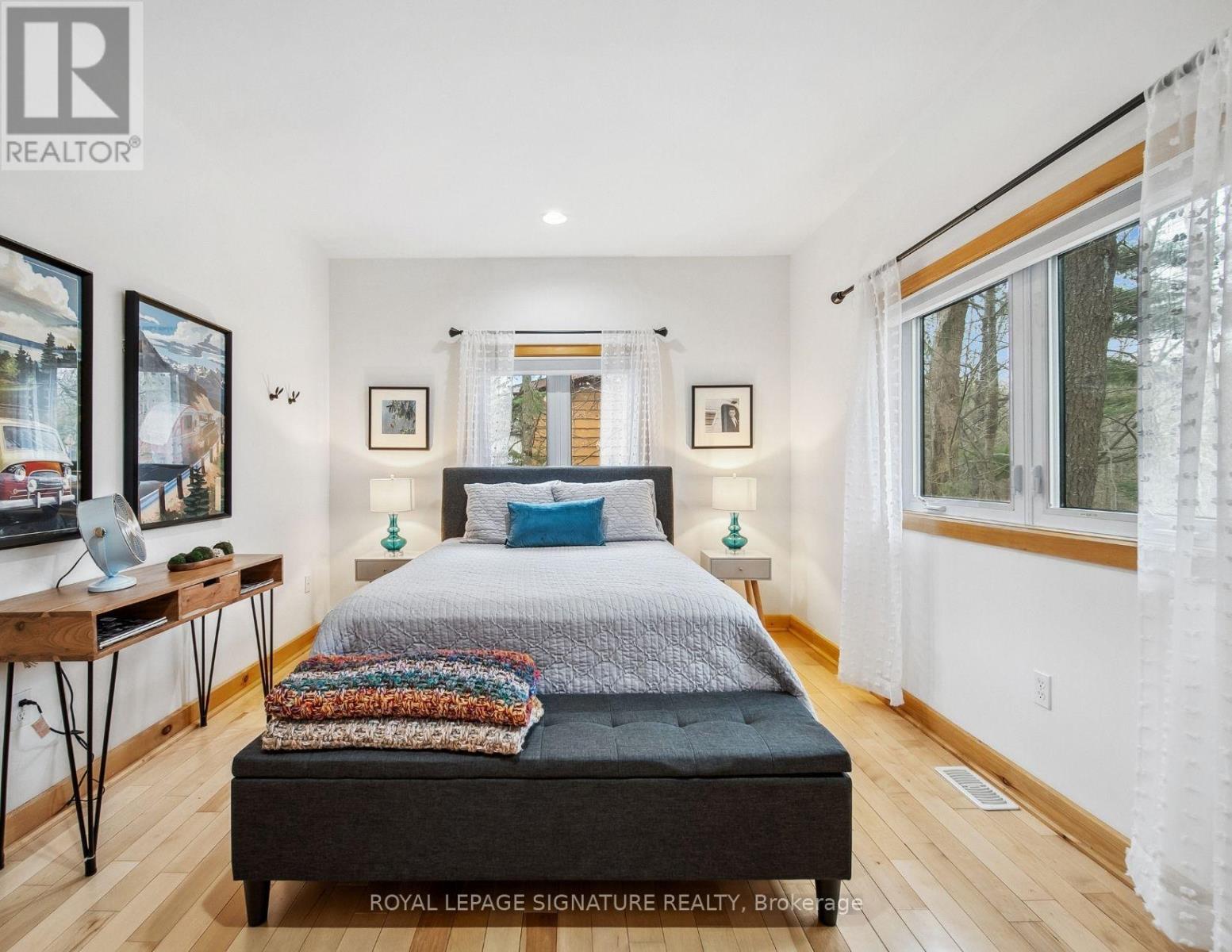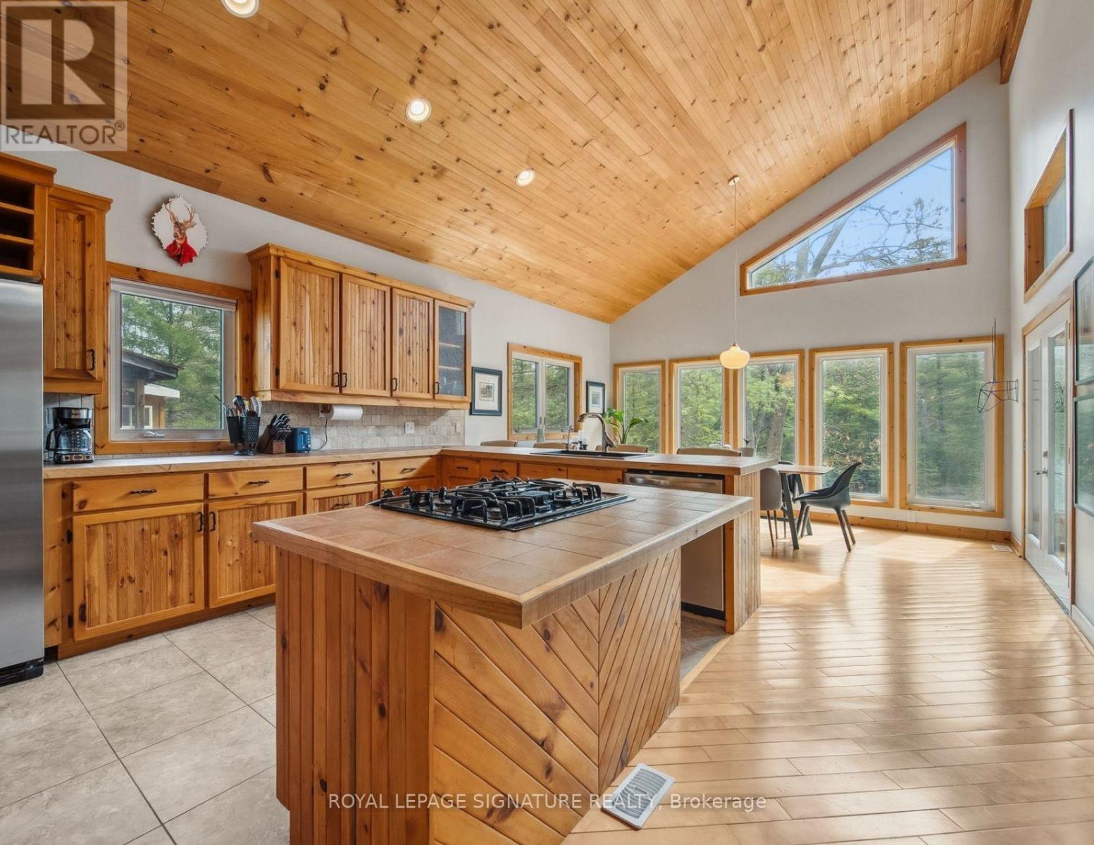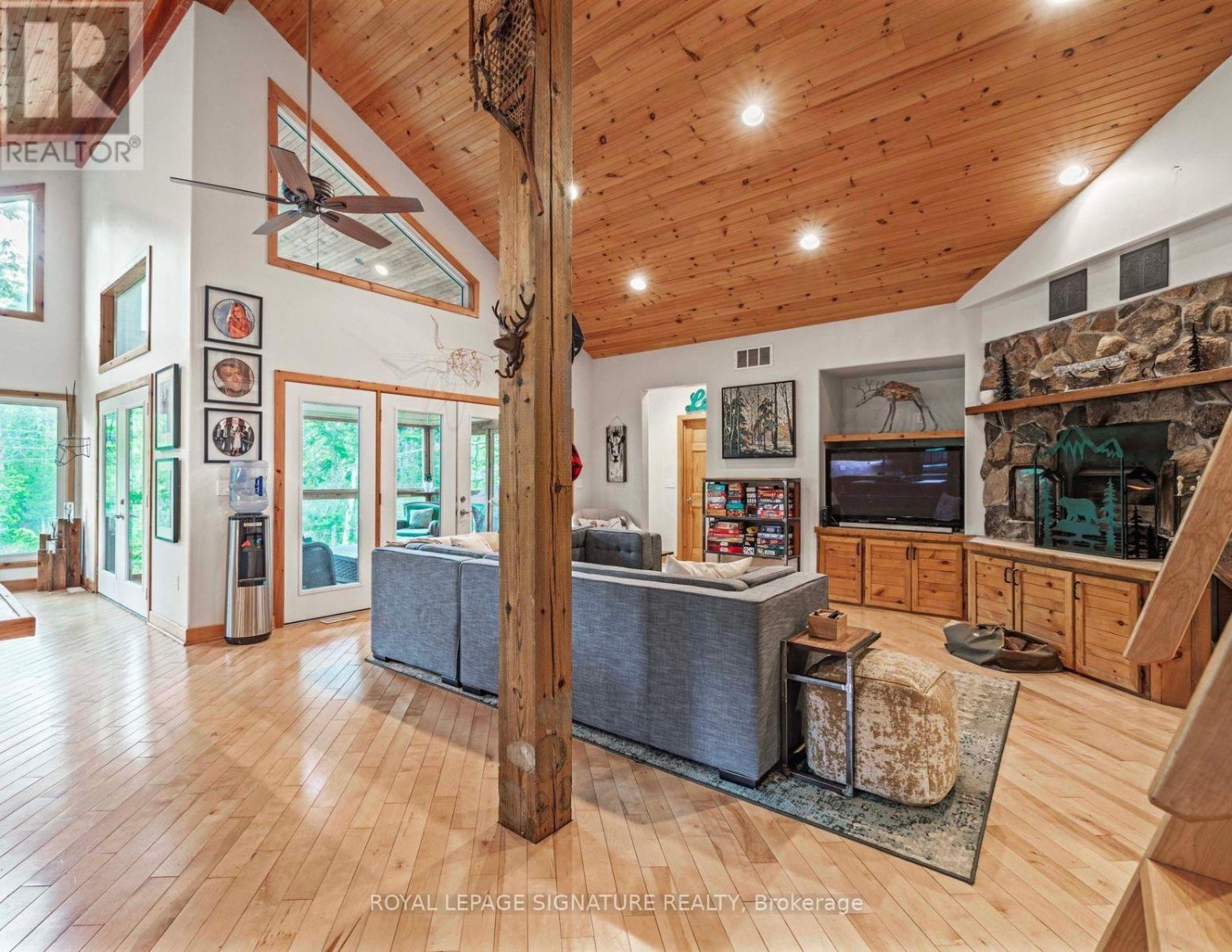 WATERFRONT HOME. *ALL FURNITURE INCLUDED. Experience the tranquility of waterfront living with stunning elevated views from this beautiful home located on the Severn (Green) River in WASHAGO. This private residence features three large bedrooms and three bathrooms, providing ample space for family and guests. The light-filled open-concept great room seamlessly connects to the kitchen and dining area, showcasing a striking cathedral tongue and groove pine ceiling complemented by hardwood and ceramic flooring. The beautiful stone wood burning fireplace adds warmth to the living space, perfect for cozy evenings. The versatile upper loft offers additional living space that can be adapted to suit your needs, whether as a home office, play area, or guest retreat. Spacious bathrooms feature large tiled walk-in showers for a touch of luxury. Enjoy effortless indoor/outdoor living with walkouts that lead to a tranquil decks and the screened-in porch, where you can soak in the hot tub and take in the amazing tree top views overlooking the river. The property boasts 81 feet of waterfront, complete with a dock for your boating adventures and a large detached garage with windows + electric garage door for convenient storage. Located just 10 minutes North of Orillia, 1.5 Hours to GTA via 400 on a paved municipally maintained road, across from the Alexander Hope Smith Nature Reserve. Easy access to HWY 11 and central in Simcoe/Muskoka for a variety of recreation activities, close to Casino Rama, Centennial Park, Mount St. Louis, shopping, restaurants,entertainment and so much more. Don't miss the opportunity to make this stunning waterfront home your own and embrace a lifestyle of peace and beauty on the River! Don't miss the virtual tour! (id:53503)