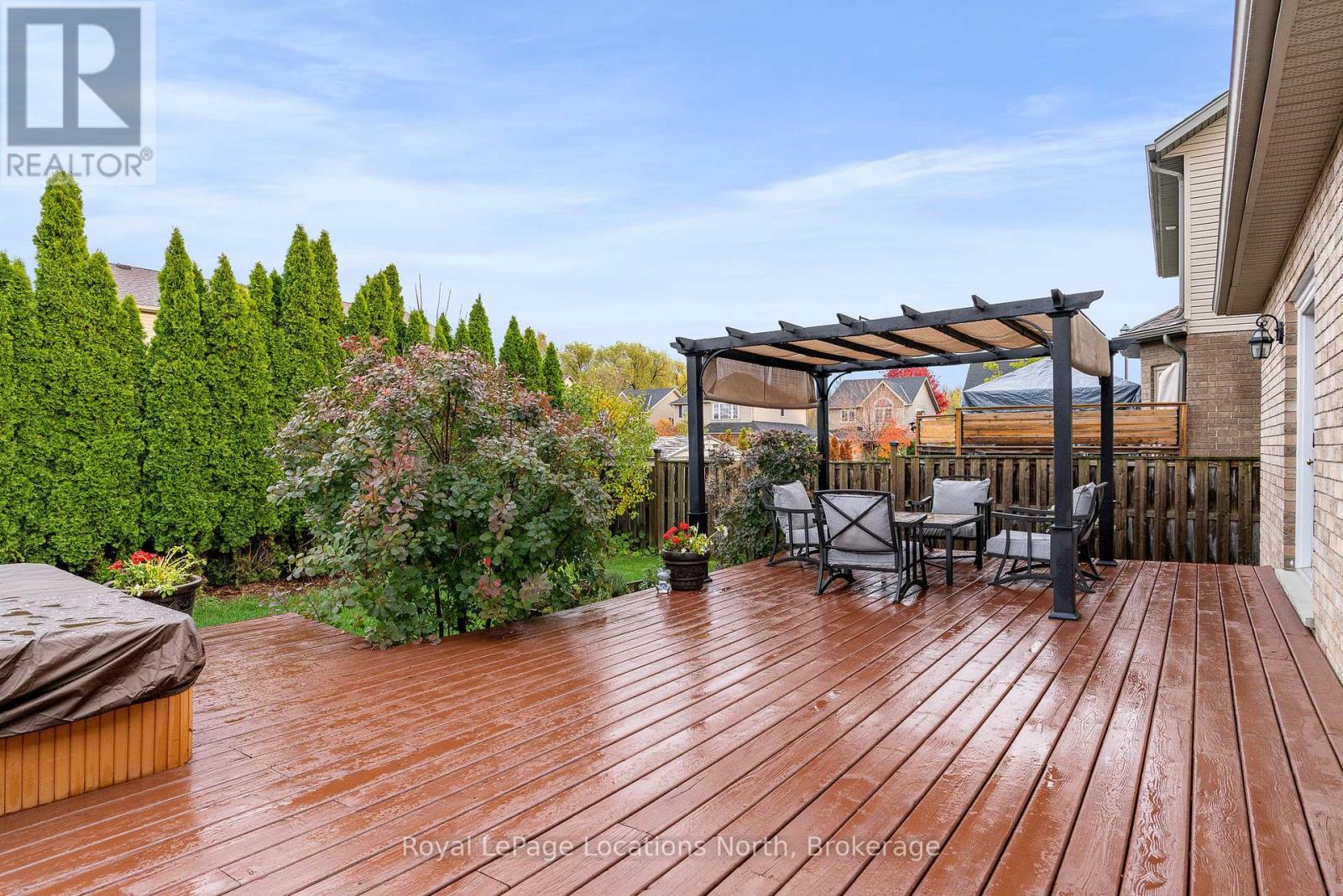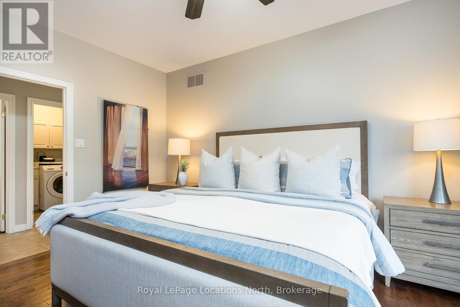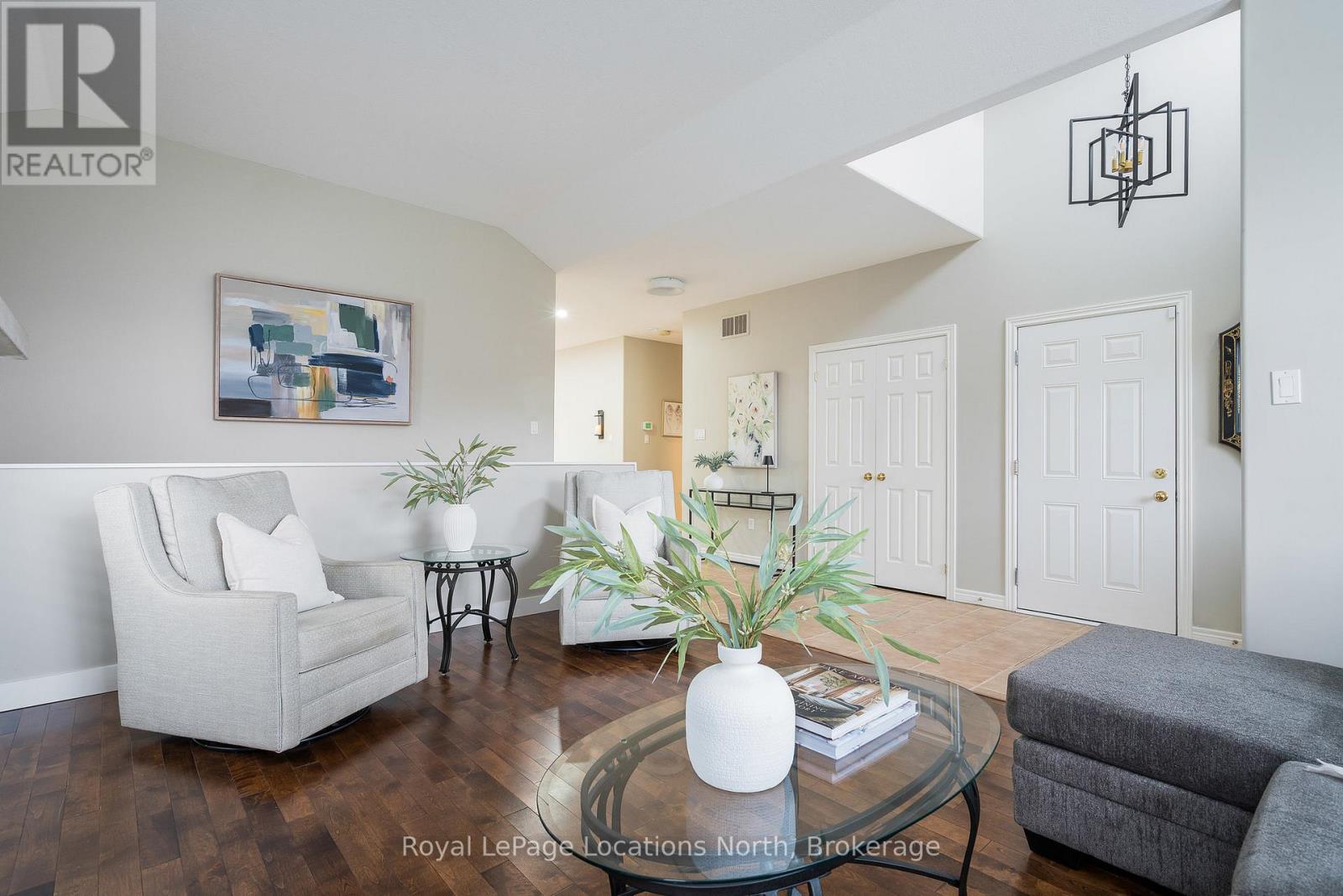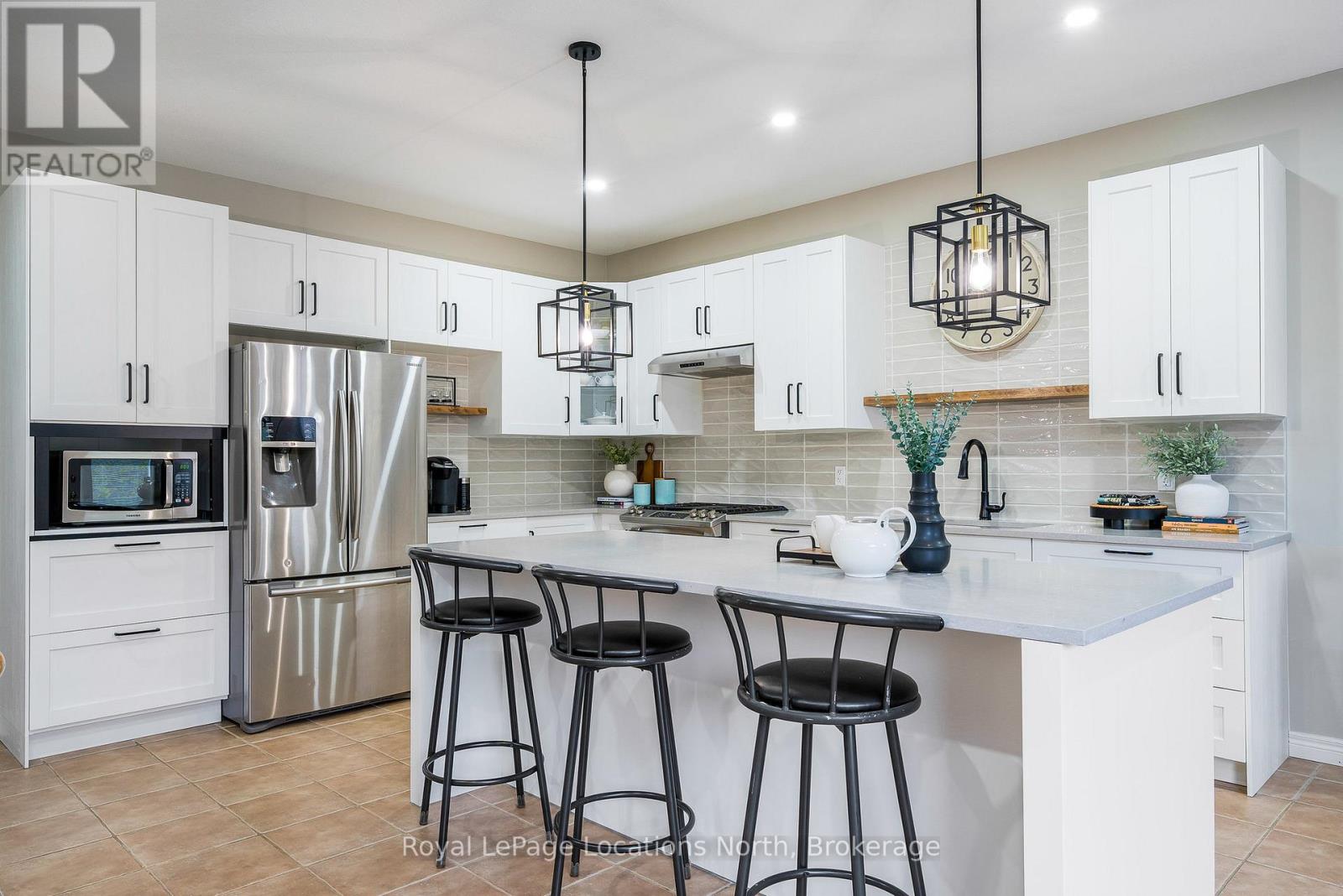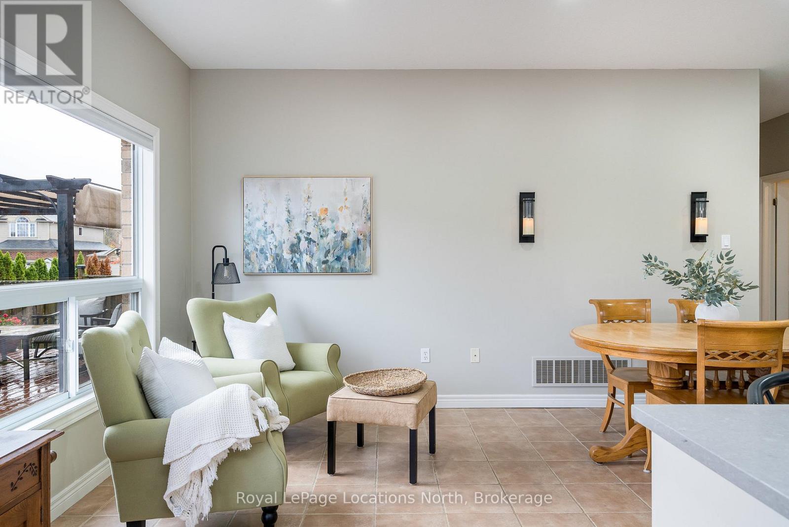 Nestled on a picturesque street in the sought-after Creekside community, this exceptional bungalow offers effortless, turn-key living. Thoughtfully designed and meticulously maintained, this home combines elegant style, comfort, and practicality, perfect for both everyday living and entertaining. From the moment you arrive, you'll be charmed by beautifully landscaped gardens and a welcoming west-facing front porch. Inside, the bright and spacious foyer with vaulted ceiling leads to an open-concept living area filled with natural light. A stunning picture window and cozy gas fireplace create an inviting atmosphere. The new kitchen is a dream showcasing timeless cabinetry, a sit-up breakfast bar, and newer stainless steel appliances. Step from the dining area to the private backyard, featuring a large deck with hot tub surrounded by lush cedar hedging for exceptional privacy. The main floor features two generous bedrooms and two full bathrooms, including a peaceful primary suite with walk-in closet, ensuite, and direct access to the deck, the perfect spot for morning coffee. The guest bedroom enjoys its own access to a thoughtfully designed 3-piece bath with a curb-free, walk-in shower using the premium Schluter waterproofing system, ideal for accessibility and ease of use. Main floor laundry adds everyday convenience. The finished lower level offers bright, versatile living space with recessed lighting, a gas fireplace, a third bedroom, stunning full bathroom (also with curb-less shower), and an expansive flex room. A double garage with inside entry completes this exceptional home. Designed with accessibility in mind from wider doorways to barrier-free bathrooms and ideally located across from a park and steps to the Collingwood Trail system, this home offers the perfect blend of lifestyle, comfort, and community - a place where every detail has been carefully considered for years of enjoyment. (id:53503)