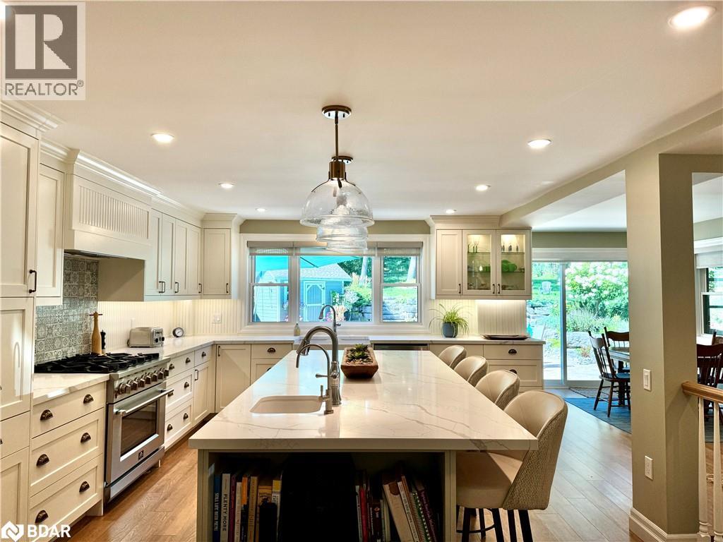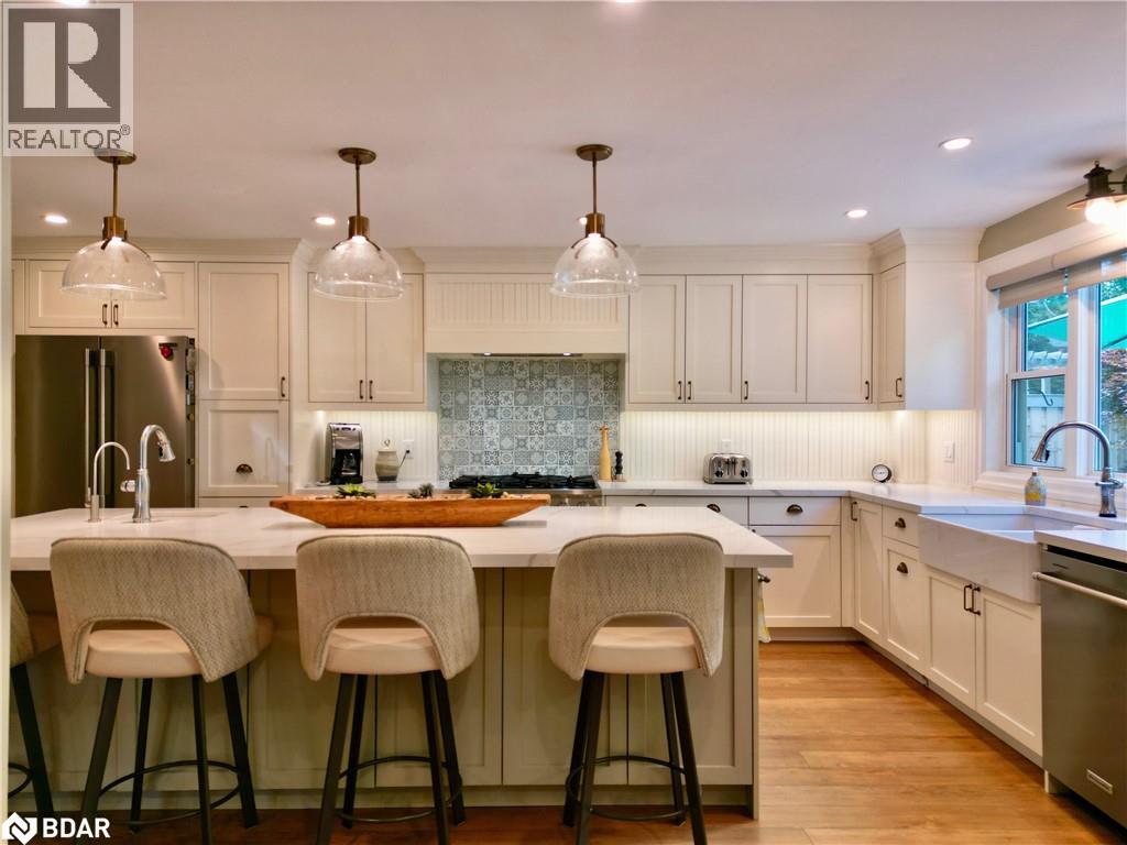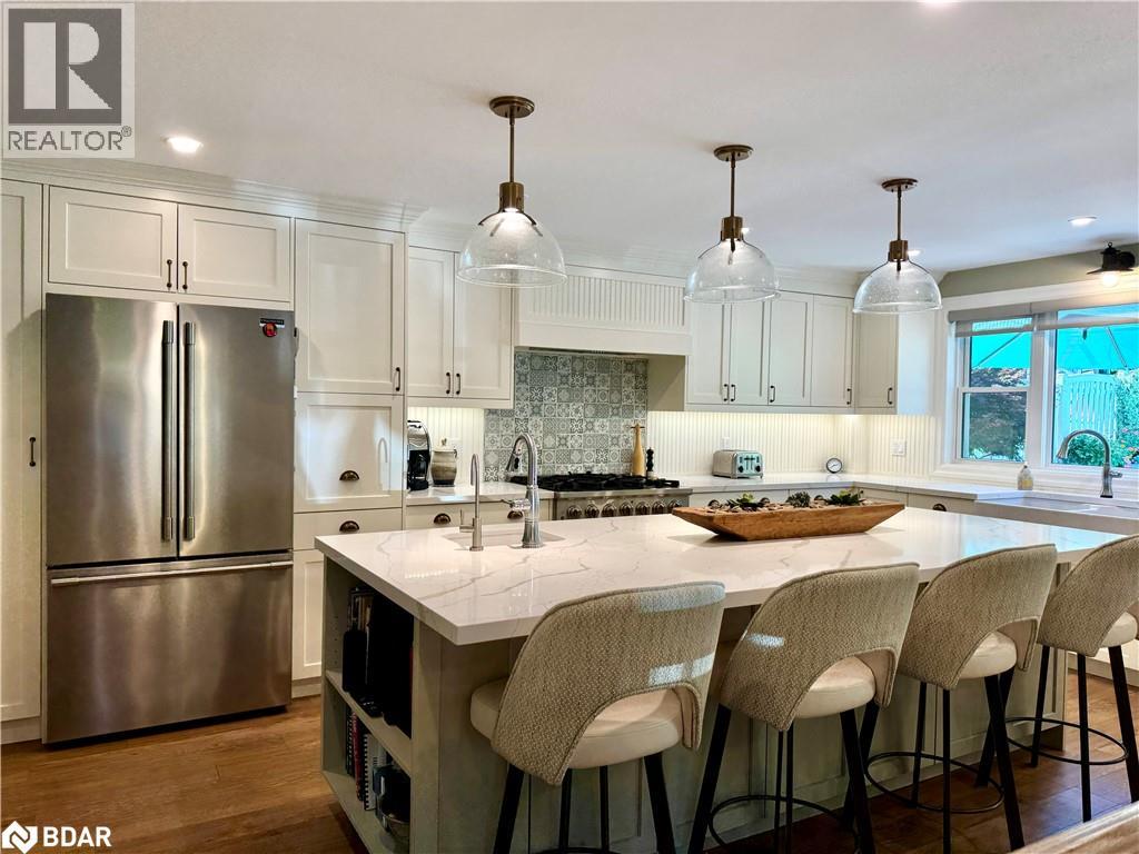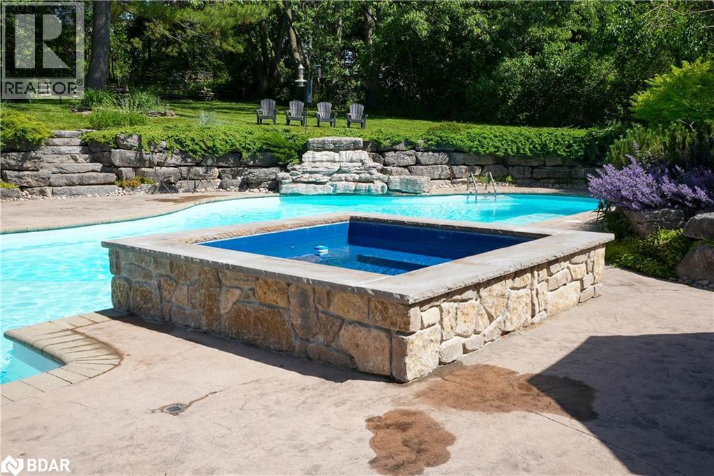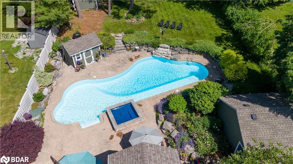 This rare, updated century home in the heart of Barrie offers the perfect blend of historic charm and modern luxury on a private 0.62-acre lot. Tucked away on a quiet, tree-lined street, the home is surrounded by mature trees, perennial gardens, and flagstone walkways, with outstanding curb appeal and a welcoming traditional front porch. Inside, the newly renovated kitchen features engineered laminate floors, a 9-foot island, farmhouse sink, built-in coffee station, and views of the backyard oasis. The main floor includes a family room, separate office, laundry area, and a screened three-season porch with an infrared heater—ideal for relaxing in any weather. The home has been freshly painted and fitted with custom California shutters and blinds throughout. Upstairs, there are three bedrooms, including a grand primary suite with walk-in closet and a spa-style ensuite offering an oversized glass shower, his-and-hers sinks, Roman tub, makeup vanity, and large windows for natural light. A total of 3.5 bathrooms ensures comfort and convenience for the entire household. The finished basement provides a second family room with gas fireplace, a full in-law kitchen, and a flex room perfect for guests or a gym. The backyard is a true retreat featuring a 60-foot inground pool with swim lane and waterfall, an 8-person hot tub, and a cedar-lined pool house with a changeroom and bathroom. Poured and stamped concrete surrounds the outdoor space, along with two custom wood sheds and vibrant perennial landscaping framed by armour stone. Additional highlights include a double car garage, Generac 20kW natural gas generator, and whole-home water filtration system. This is a rare chance to own a character-filled home that delivers on privacy, space, and lifestyle—right in the heart of Barrie. (id:53503)