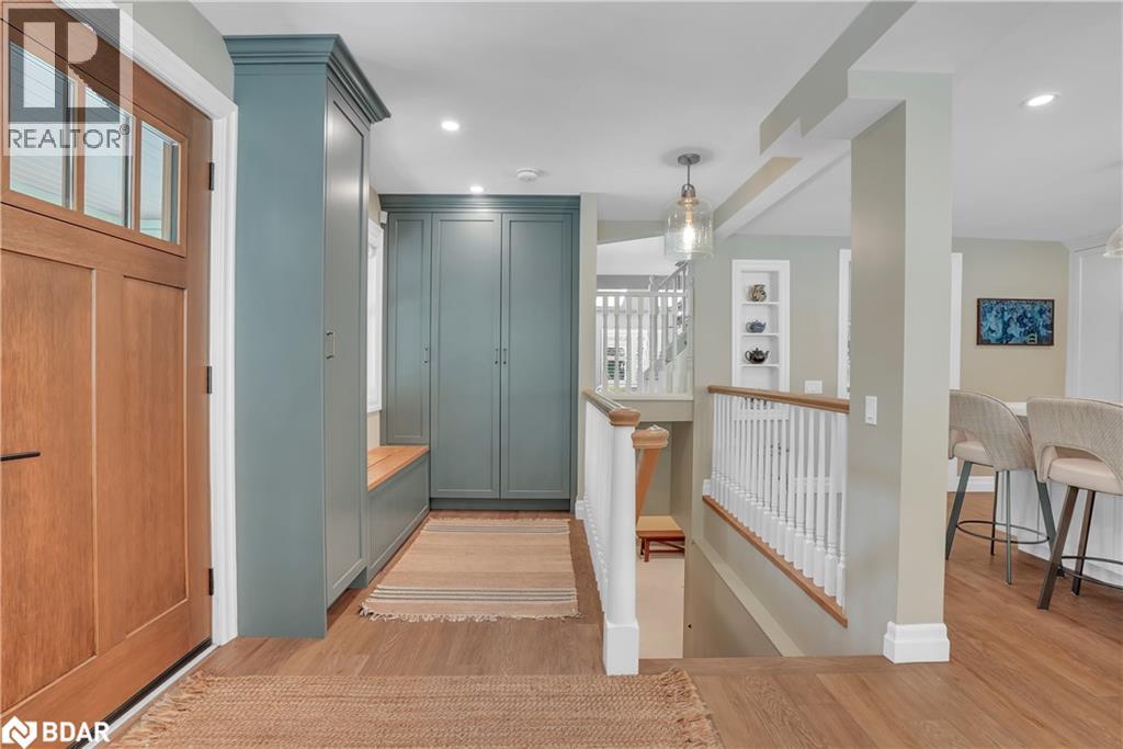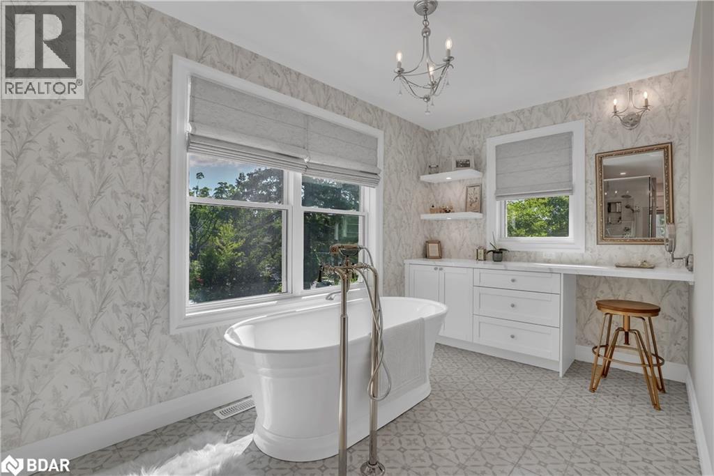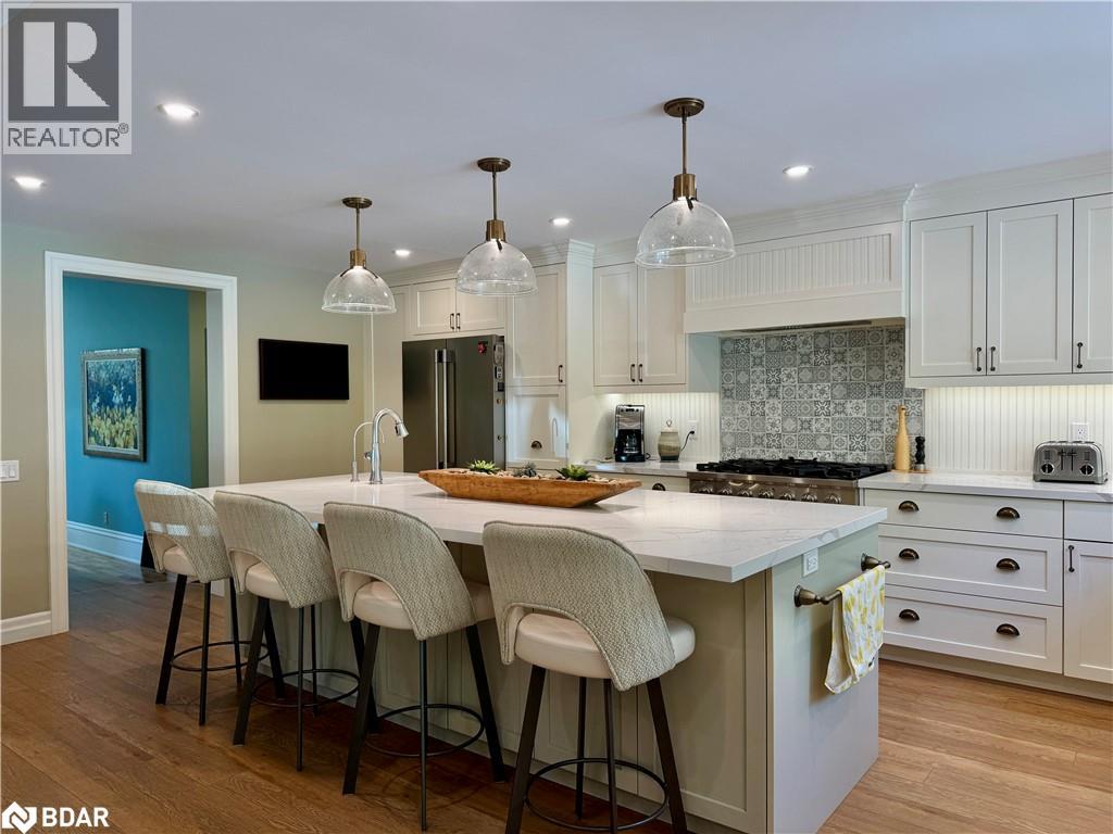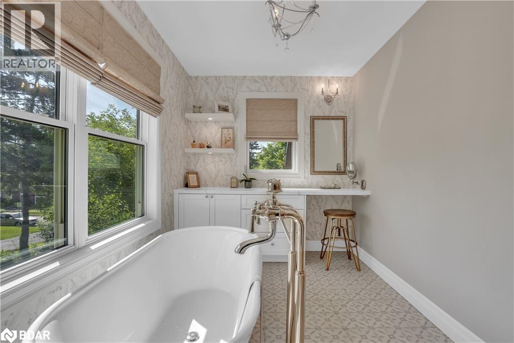 This rare, updated century home in the heart of Barrie offers the perfect blend of historic charm and modern luxury on a private 0.62-acre lot. Tucked away on a quiet, tree-lined street, the home is surrounded by mature trees, perennial gardens, and flagstone walkways, with outstanding curb appeal and a welcoming traditional front porch. Inside, the newly renovated kitchen features engineered laminate floors, a 9-foot island, farmhouse sink, built-in coffee station, and views of the backyard oasis. The main floor includes a family room, separate office, laundry area, and a screened three-season porch with an infrared heater—ideal for relaxing in any weather. The home has been freshly painted and fitted with custom California shutters and blinds throughout. Upstairs, there are three bedrooms, including a grand primary suite with walk-in closet and a spa-style ensuite offering an oversized glass shower, his-and-hers sinks, Roman tub, makeup vanity, and large windows for natural light. A total of 3.5 bathrooms ensures comfort and convenience for the entire household. The finished basement provides a second family room with gas fireplace, a full in-law kitchen, and a flex room perfect for guests or a gym. The backyard is a true retreat featuring a 60-foot inground pool with swim lane and waterfall, an 8-person hot tub, and a cedar-lined pool house with a changeroom and bathroom. Poured and stamped concrete surrounds the outdoor space, along with two custom wood sheds and vibrant perennial landscaping framed by armour stone. Additional highlights include a double car garage, Generac 20kW natural gas generator, and whole-home water filtration system. This is a rare chance to own a character-filled home that delivers on privacy, space, and lifestyle—right in the heart of Barrie. (id:53503)