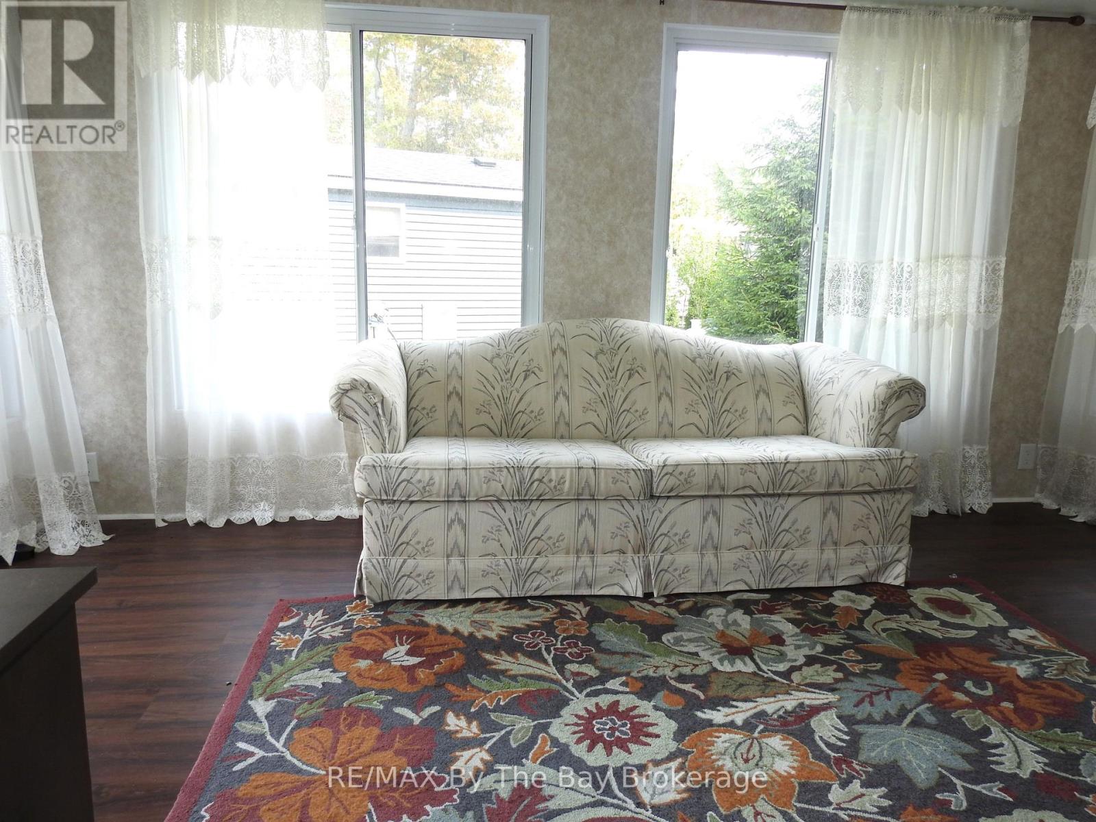 Turn-Key Three-Season Cottage in Wasaga CountryLife Resort! This fully furnished and move-in-ready mobile cottage offers comfortable living with two spacious bedrooms. The living room features a versatile pull-out sofa, and the bright sunroom also includes a pull-out sofa, providing ample sleeping space for up to nine guests or family members. The sunroom is perfect for relaxing and enjoying the outdoors throughout the season. Ideally located within the resort, this cottage is just steps away from swimming pools, a children's park, and scenic trails that lead to the beautiful beaches of Georgian Bay. The yard is enhanced with mature spruce and maple trees, creating a peaceful and private outdoor oasis. Conveniently close to shopping, golf courses, and other amenities, the park also features a lively recreation center that hosts events and activities for all ages. This is an ideal getaway for those seeking a vibrant community and easy access to both nature and leisure. 2025 Seasonal Site Fees $6504 +HST. Sale price includes $750 2026 Site Fee Deposit (id:53503)