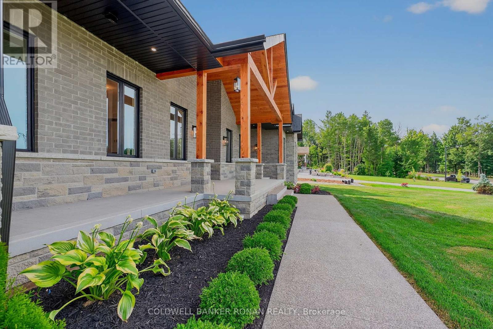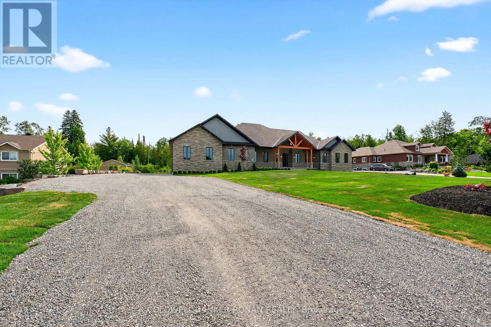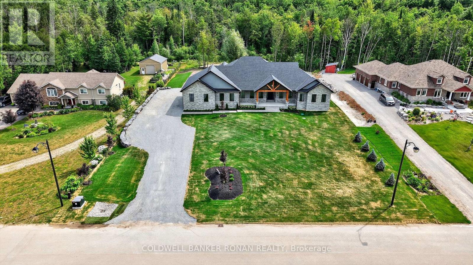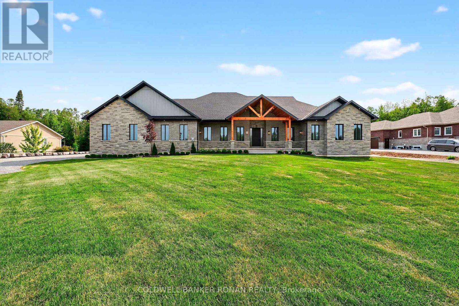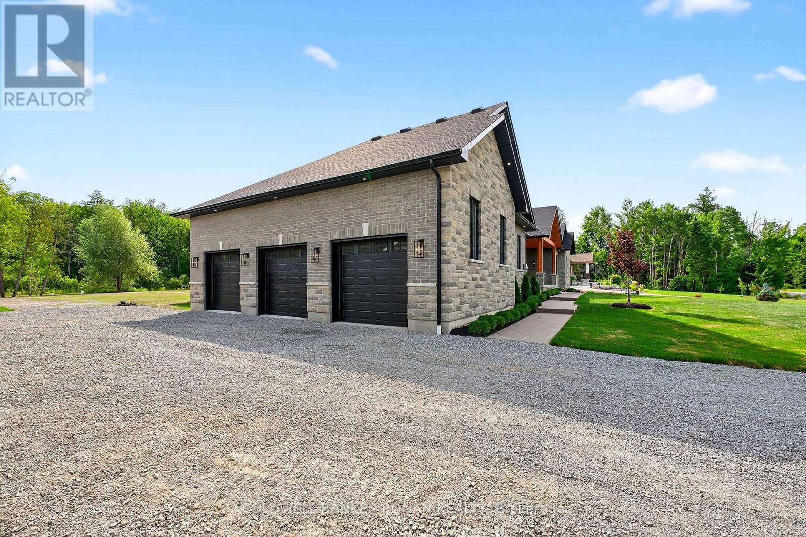 BONUS - $20,000 towards finishing the basement or other upgrades!!! Brand New. Sprawling 3100 sq ft Custom stone and brick bungalow on over an acre. From the large entrance way and office/library Experience high end finishings throughout, from the wide plank hardwood floors to the light fixtures, Jen Air appliances and riobel bathroom fixtures. Massive kitchen /living room divided by a floor to ceiling stone double sided fireplace, a massive island, butlers pantry with espresso bar and a walk out to the expansive covered back deck overlooking the pool sized yard and enchanting forest. Principal bedroom with beautiful feature wall, walk through custom closet and an ensuite designed for the most scrutinizing individuals. Main floor laundry and large mudroom area off the 40x30 ft garage with walk up from the basement, oversized garage doors and enough ceiling height for a car lift in each bay with room left over for the toys. Bedroom wing with 3 beds and 2 full baths. Basement with 9 ft ceilings rough in for another bath. Landscaping package w/ exposed stone concrete walkway, paved driveway, entrance garden with two trees, sodded front yard and hydro seeded back yard. Great commuter location with easy access to Barrie and hwy 400. (id:53503)