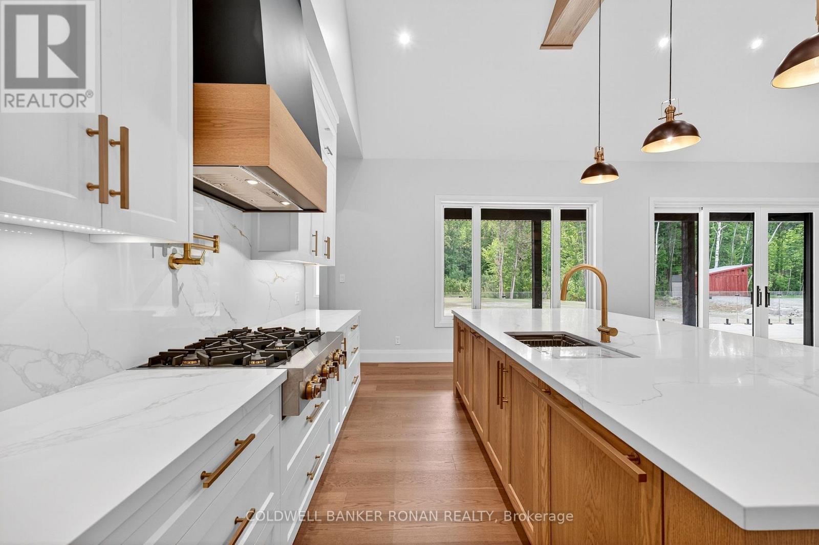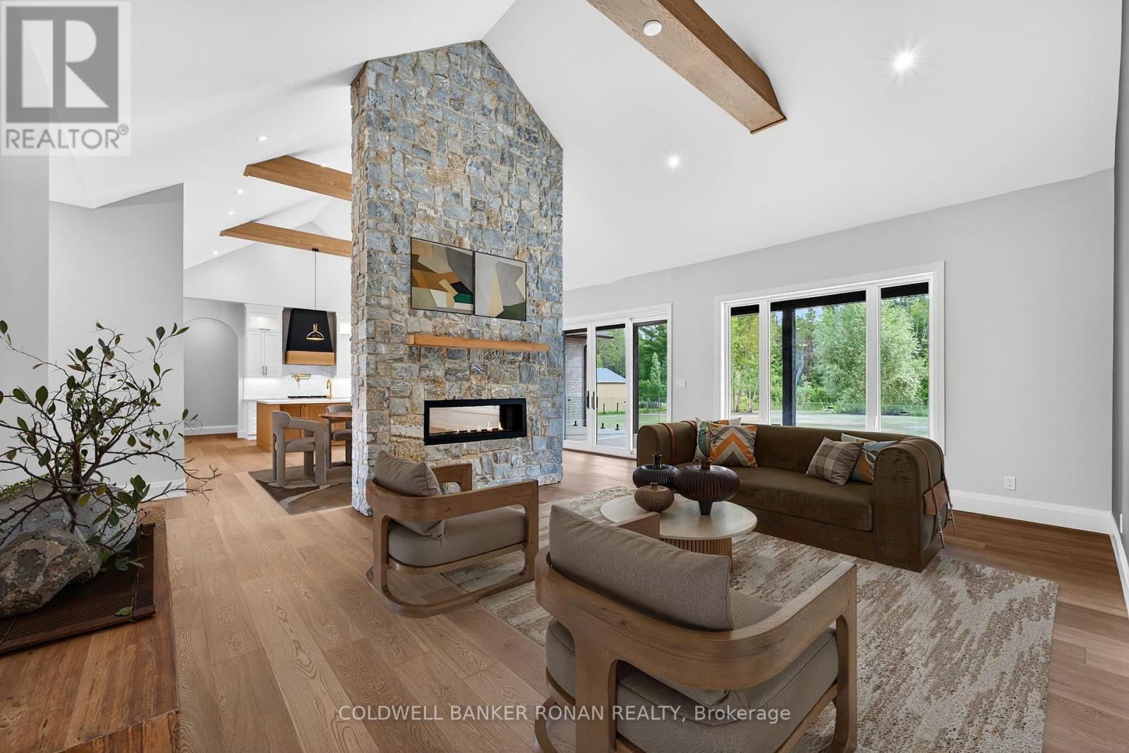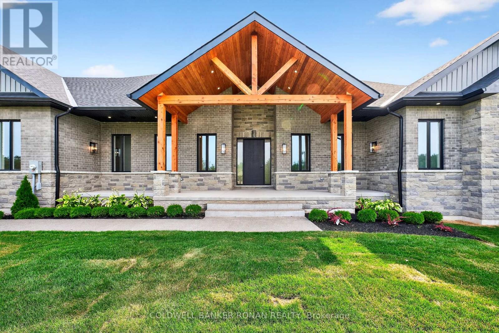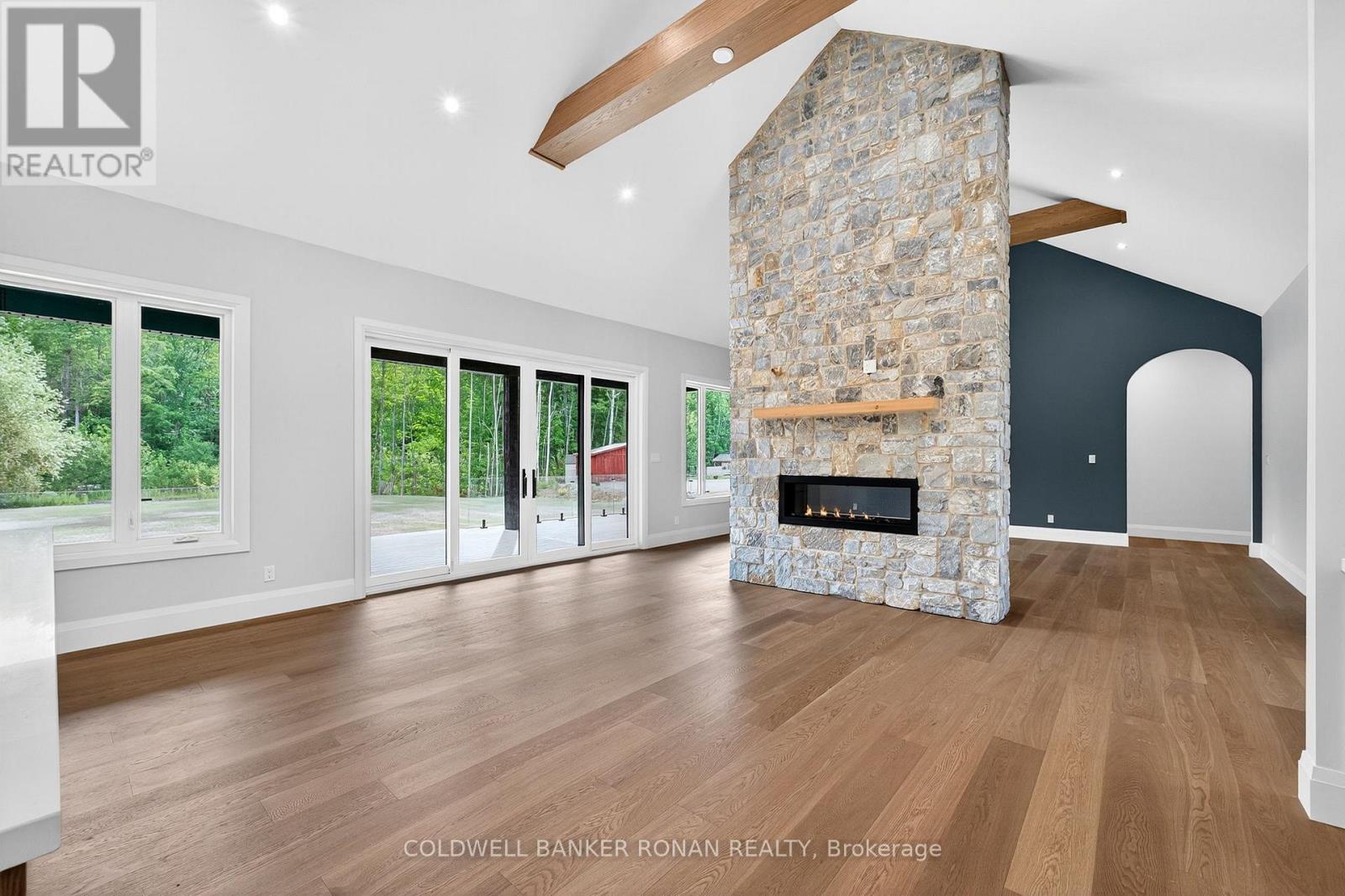 BONUS - $20,000 towards finishing the basement or other upgrades!!! Brand New. Sprawling 3100 sq ft Custom stone and brick bungalow on over an acre. From the large entrance way and office/library Experience high end finishings throughout, from the wide plank hardwood floors to the light fixtures, Jen Air appliances and riobel bathroom fixtures. Massive kitchen /living room divided by a floor to ceiling stone double sided fireplace, a massive island, butlers pantry with espresso bar and a walk out to the expansive covered back deck overlooking the pool sized yard and enchanting forest. Principal bedroom with beautiful feature wall, walk through custom closet and an ensuite designed for the most scrutinizing individuals. Main floor laundry and large mudroom area off the 40x30 ft garage with walk up from the basement, oversized garage doors and enough ceiling height for a car lift in each bay with room left over for the toys. Bedroom wing with 3 beds and 2 full baths. Basement with 9 ft ceilings rough in for another bath. Landscaping package w/ exposed stone concrete walkway, paved driveway, entrance garden with two trees, sodded front yard and hydro seeded back yard. Great commuter location with easy access to Barrie and hwy 400. (id:53503)